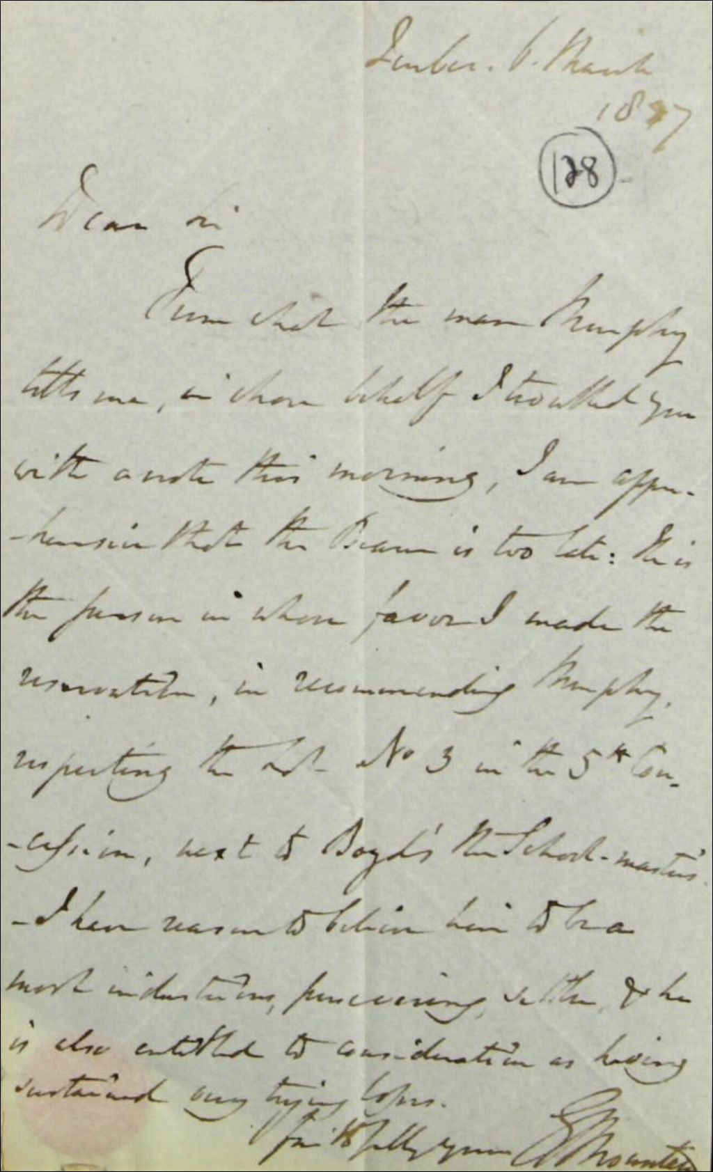 Les deux premières pièces sont des lettres d'A. Mountain à John Stewart, de la Commission des biens des Jésuites, à propos du lot numéro 3 dans la cinquième concession [de la seigneurie Saint-Gabriel] à côté de Boyd; la troisième pièce est une lettre de Wolff, ancien adjudant du 60ième régiment et résidant de Valcartier, qui certifie connaître James Donahue (Donaghue) depuis deux ans, 6 mars 1827, Archives nationales à Québec, Fonds Ministère des Terres et Forêts, (03Q,E21,S64,SS5,SSS6,D128).