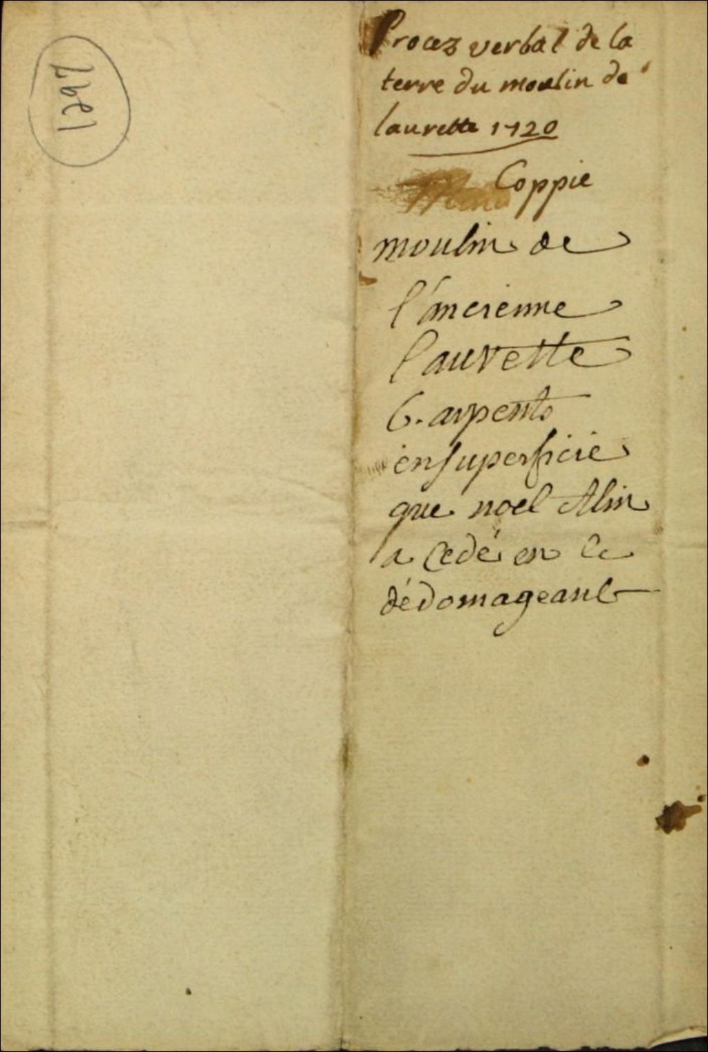 Procès-verbal d'arpentage de la terre du moulin de Laurette (Lorette), à la requête du Révérend Père Jésuite Dupuys (Dupuis) et de Noël Alin (Alain, Allain), habitant de l'Ancienne-Lorette, par Noël Beaupré, arpenteur juré, 26 août 1720, Archives nationales à Québec, Fonds Ministère des Terres et Forêts, (03Q,E21,S64,SS5,SSS6,D1297).