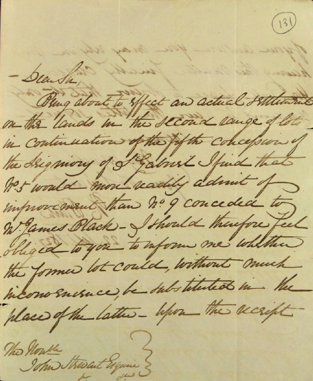 Lettre de Black à John stewart, écuyer, à propos des titres de propriété des lots 5 et 9 du deuxième rang de la cinquième concession dans la seigneurie Saint-Gabriel, 22 septembre 1827, Archives nationales à Québec, Fonds Ministère des Terres et Forêts, (03Q,E21,S64,SS5,SSS6,D131).