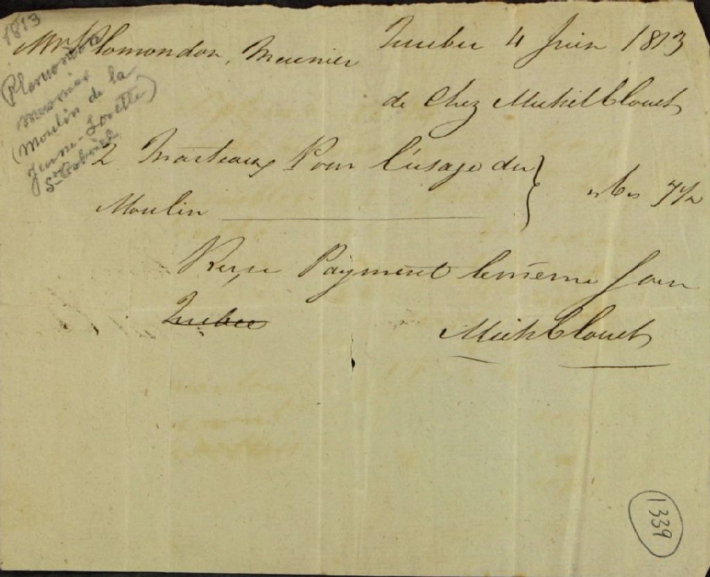 État de compte émis à Plamondon, meunier, pour deux marteaux à l'usage du moulin, par Michel Clouet, et reçu de paiment, 4 juin 1813, Archives nationales à Québec, Fonds Ministère des Terres et Forêts, (03Q,E21,S64,SS5,SSS6,D1339).