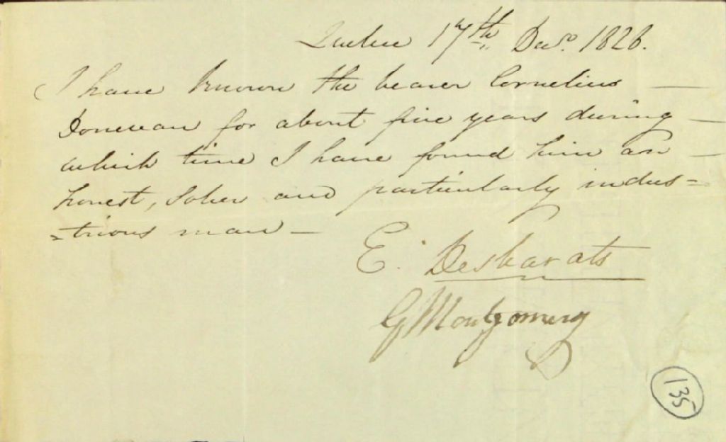 Lettre de recommandation d'E. Desbarats et G. Montgomery à l'effet que le Cornelius Donovan a été à son service durant cinq ans, 17 décembre 1828, Archives nationales à Québec, Fonds Ministère des Terres et Forêts, (03Q,E21,S64,SS5,SSS6,D135).