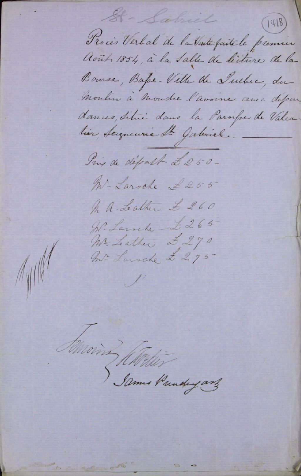 Procès-verbal de la vente faite le 1er août 1854, à la salle de lecture de la bourse, Basse-Ville de Québec, du moulin à moudre l'avoine avec ses dépendances, situé dans la paroisse de Valcartier, seigneurie Saint-Gabriel (folio 1), et conditions de la vente du moulin, accordé à Laroche (folios 2 à 5)