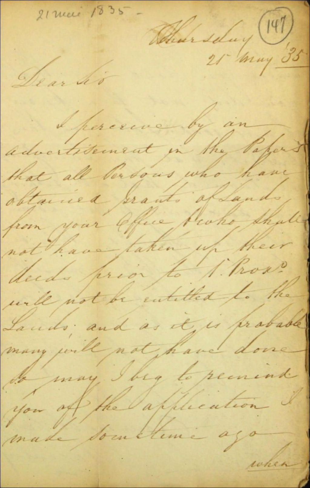 Lettre de S. McCauley à J. Stewart, à propos des titres de propriété, 21 mai 1835, Archives nationales à Québec, Fonds Ministère des Terres et Forêts, (03Q,E21,S64,SS5,SSS6,D147).