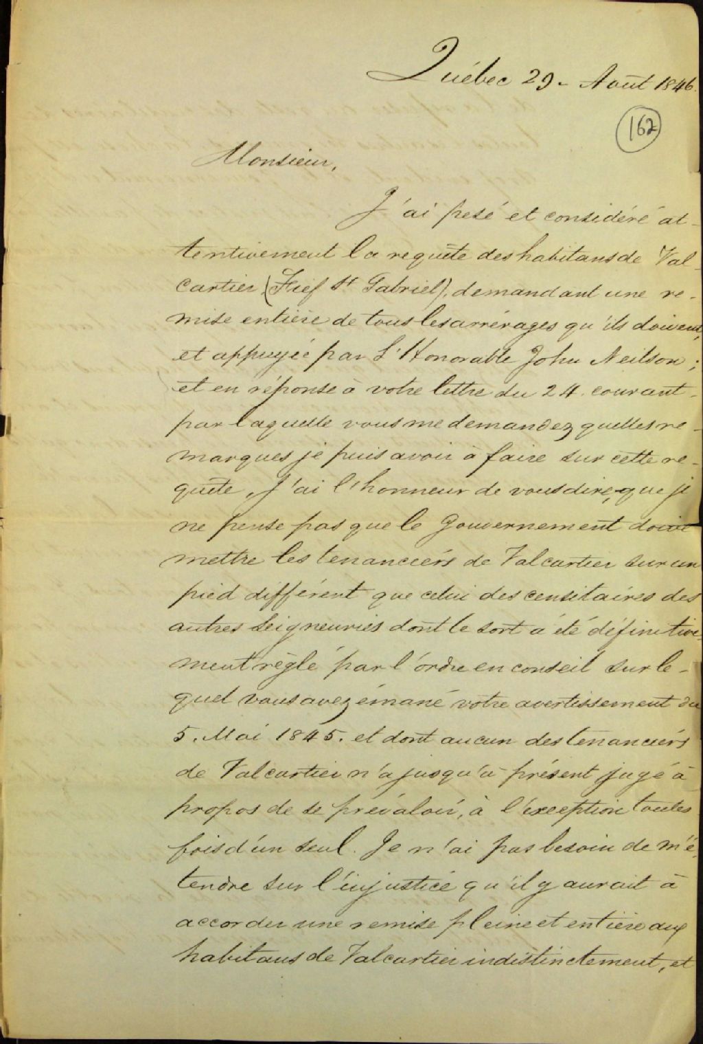 - Lettre de Louis Panet, agent des biens des Jésuites, à John Stewart, écuyer, concernant la pétition des habitants de Valcartier qui souhaitent une remise entière de tous les arrérages dus, appuyés par John Neilson; Panet est d'avis qu'aucun traitement de faveur ne devrait être accordé aux censitaires de Valcartier puisqu'ils ne sont pas dans une situation pire que celle des censitaires des autres seigneuries