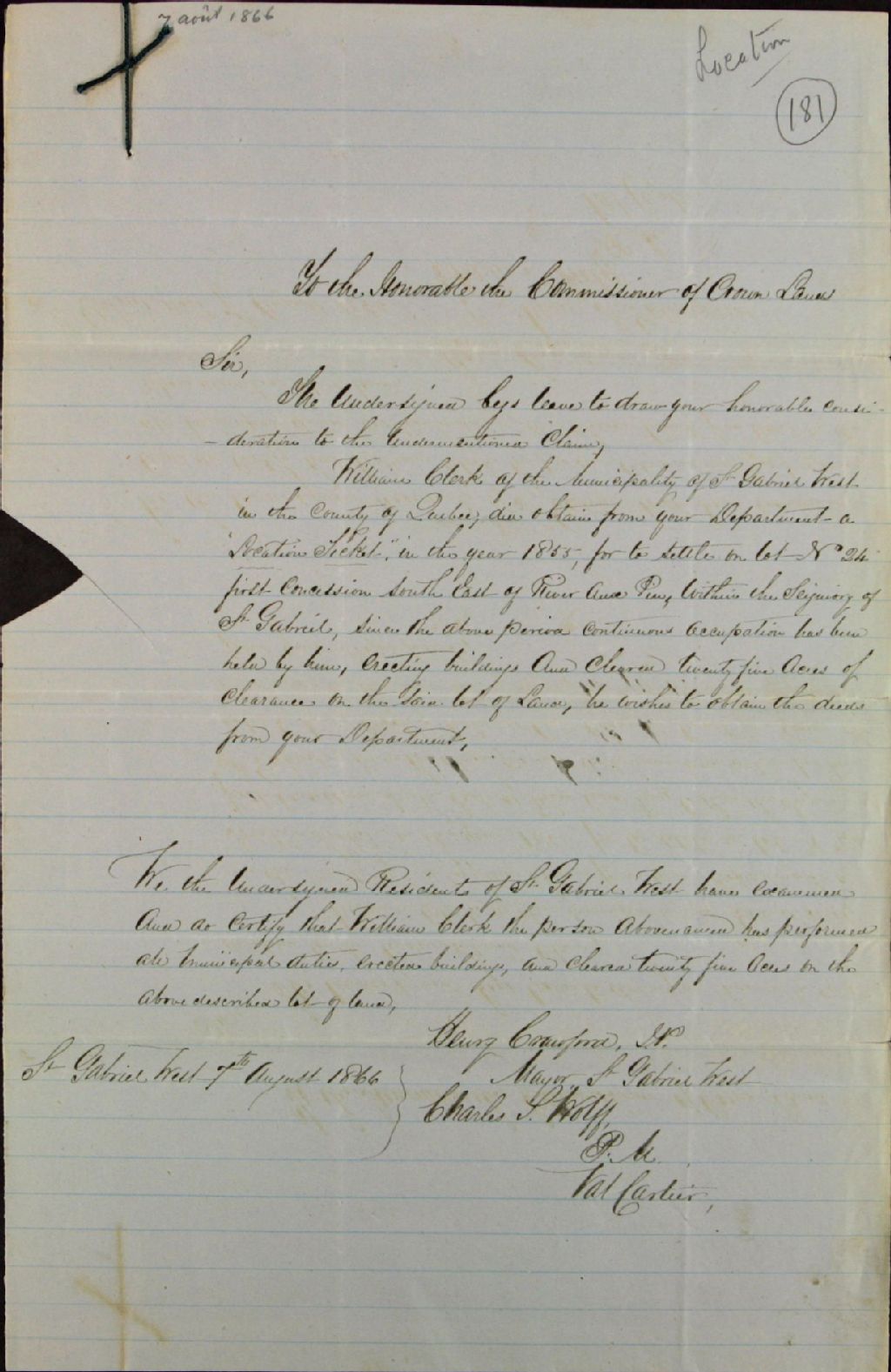Lettre de Henry Crawford, maire de Saint-Gabriel ouest, et Charles Wolff, P. M., aux commissaires des terres de la Couronne, qui sollicitent le titre de propriété de William Clerk pour le lot 24 de la première concession sud-est de la rivière aux Pins dans la seigneurie Saint-Gabriel, avec le résumé et le suivi du dossier, numéroté 400-1866, 7 août 1866, Archives nationales à Québec, Fonds Ministère des Terres et Forêts, (03Q,E21,S64,SS5,SSS6,D181).