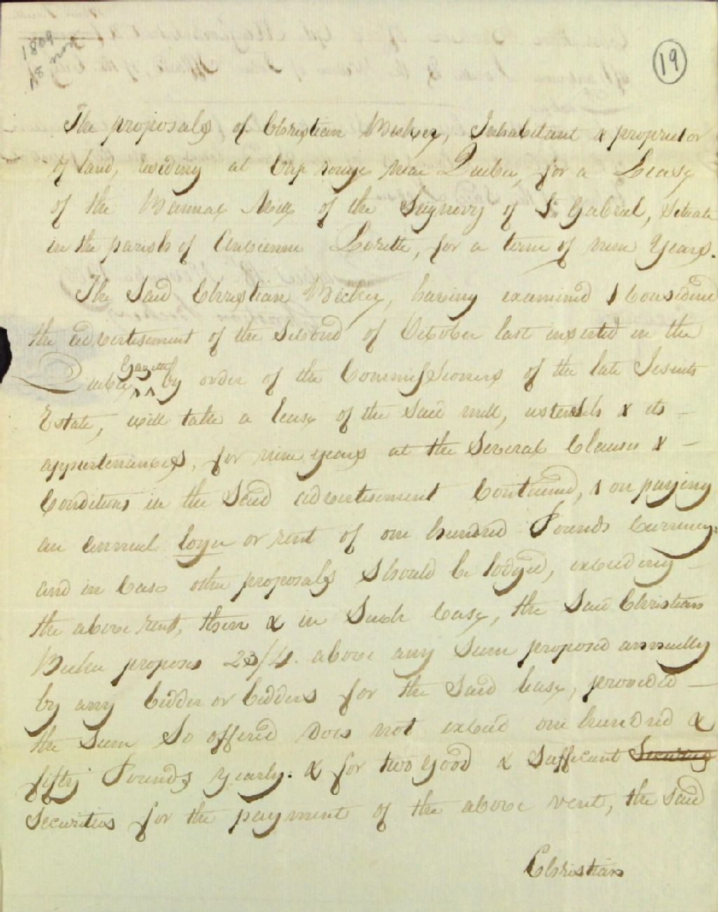 Proposition pour le bail du moulin banal de la seigneurie Saint-Gabriel à l'Ancienne-Lorette par Christian Becker, habitant de Cap-Rouge, 18 novembre 1809, Archives nationales à Québec, Fonds Ministère des Terres et Forêts, (03Q,E21,S64,SS5,SSS6,D19).