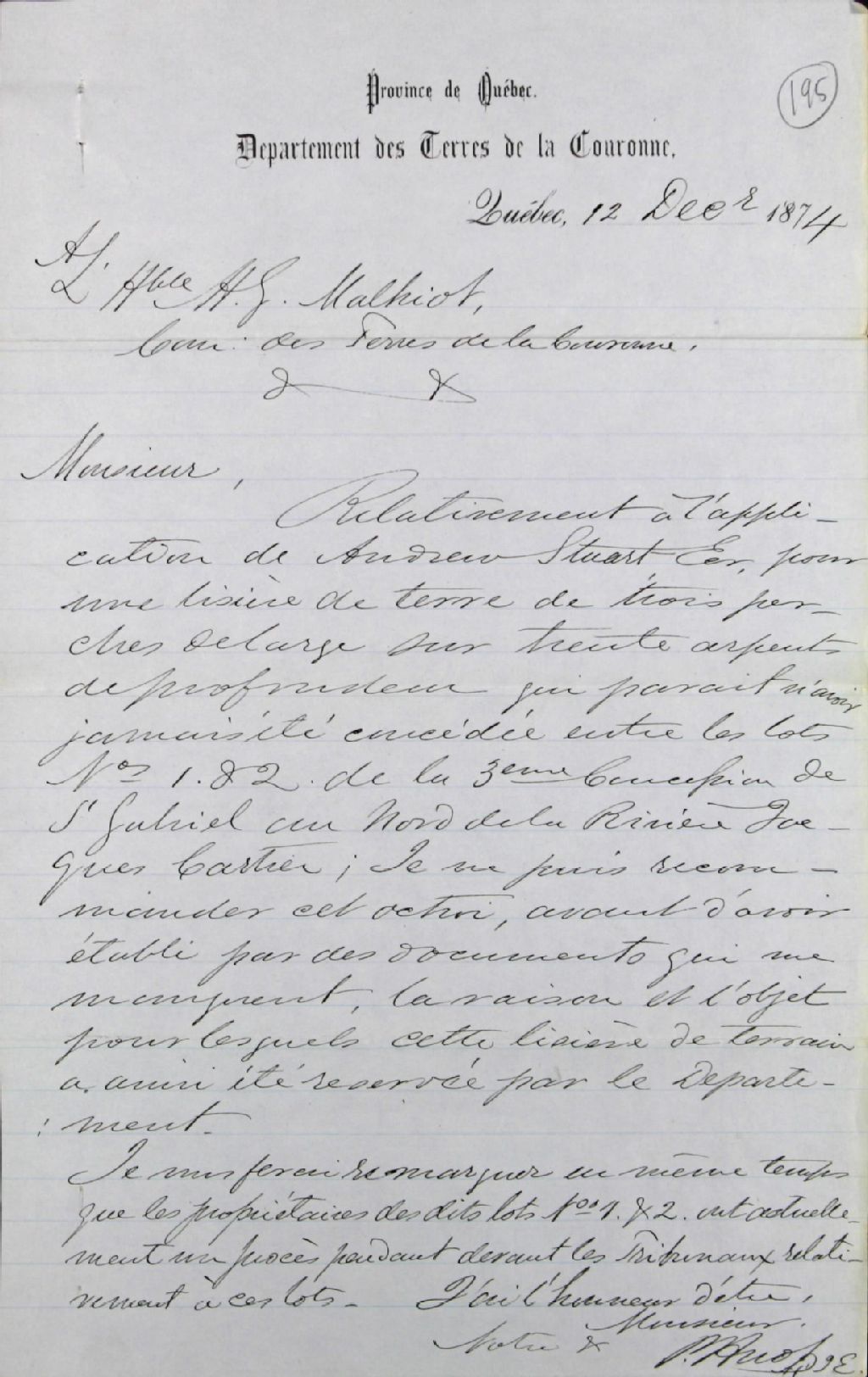 Lettre de Ph. Huot, à H. G. Malhiot, commissaire des terres de la Couronne, qui recommande de ne pas octroyer le lot demandé par Andrew Stuart, écuyer, [dans la troisième concession de la seigneurie Saint-Gabriel] puisqu'il manque des documents attestant que le lot n'est pas concédé et que les propriétaires des lots adjacents sont en procès relativement à cette portion de terre, avec le résumé et le suivi du dossier, numéroté 1516-1874, 12 décembre 1874, Archives nationales à Québec, Fonds Ministère des Terres et Forêts, (03Q,E21,S64,SS5,SSS6,D195).
