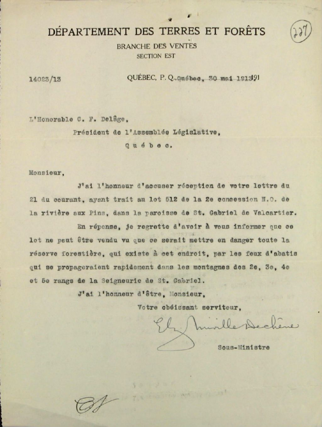Correspondance entre Cyrille F. Delâge, président de l'assemblée législative à Québec, et E. Miville Dechêne, sous-ministre du Département des Terres, concernant la vente à un électeur de C. Delâge du lot 512 de la deuxième concession nord-ouest de la rivière aux Pins à Saint-Gabriel de Valcartier ouest, avec le résumé et le suivi du dossier, numéroté 14023/13-1913, 21 mai 1913 - 30 mai 1913, Archives nationales à Québec, Fonds Ministère des Terres et Forêts, (03Q,E21,S64,SS5,SSS6,D227).
