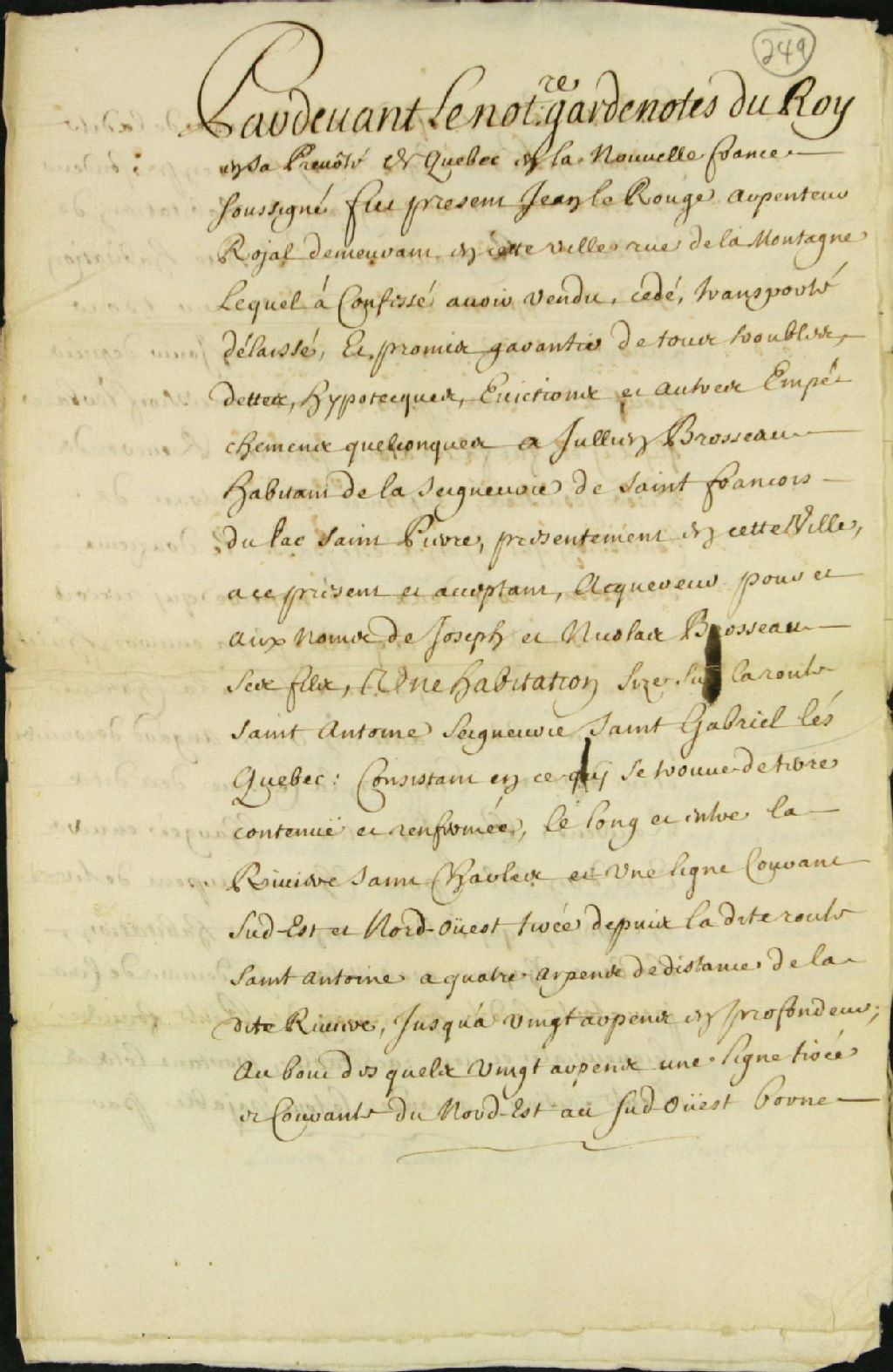Acte de vente d'une terre située sur la route Saint-Antoine dans la seigneurie Saint-Gabriel, par Jean LeRouge, arpenteur royal demeurant à Québec sur la rue de la Montagne, à Julien Brosseau, habitant de la seigneurie Saint-François du lac Saint-Pierre, au nom de ses fils Joseph et Nicolas Brosseau, par-devant François Genaple notaire et garde-notes du roi, 15 avril 1689, Archives nationales à Québec, Fonds Ministère des Terres et Forêts, (03Q,E21,S64,SS5,SSS6,D249).