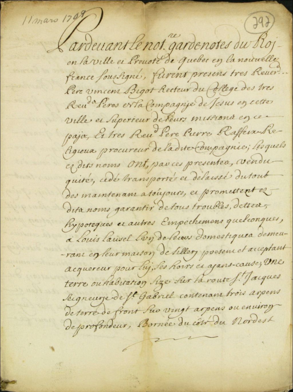 - Acte de concession d'une terre située à la route Saint-Jacques dans la seigneurie Saint-Gabriel, par les Révérends Pères Jésuites à Louis Loisel (Lausel, Lauzel), domestique des Jésuites à Sillery, par-devant François Genaple, notaire et garde-notes du roi