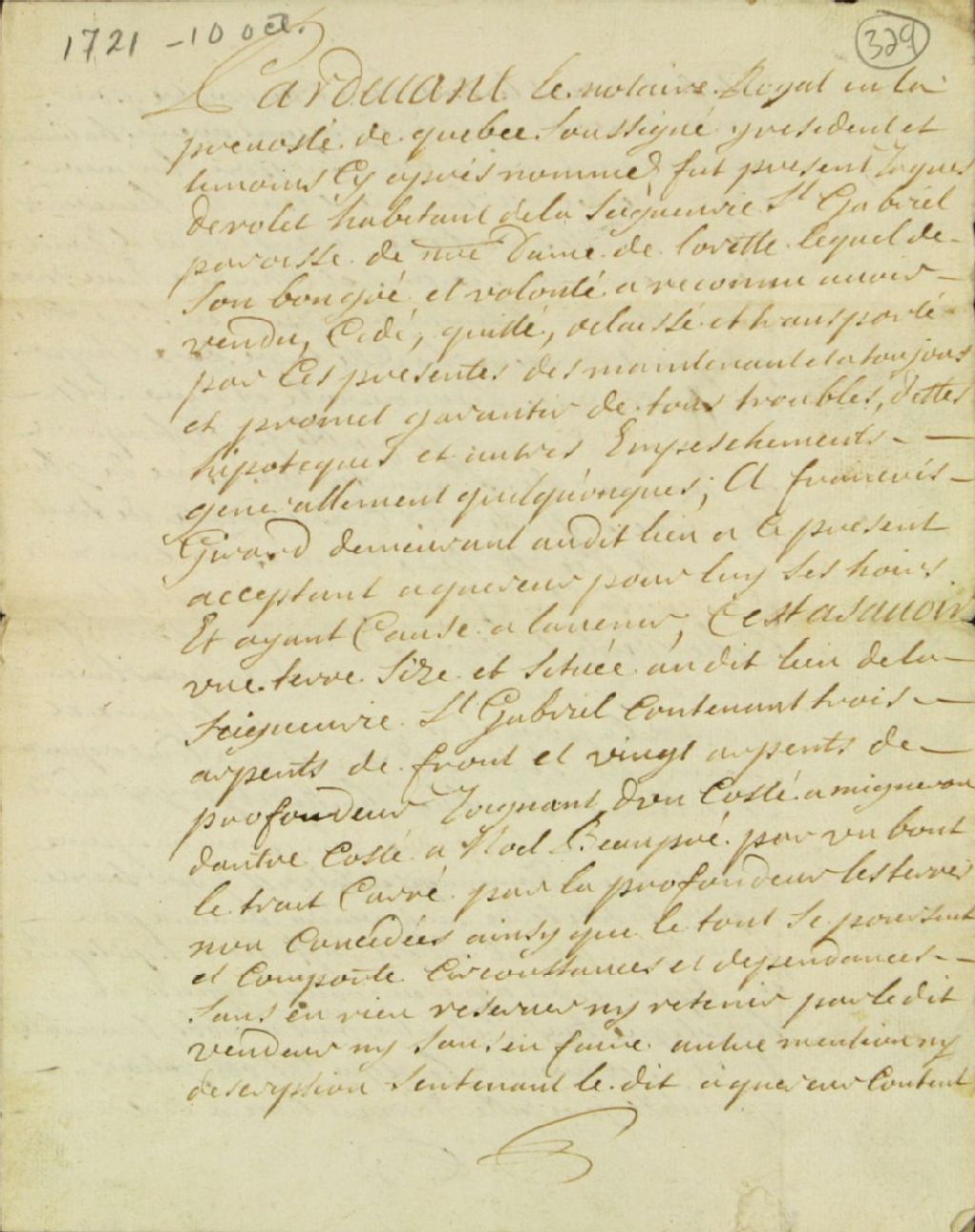 Acte de vente d'une terre située dans la seigneurie Saint-Gabriel par Jacques Drolet à François Girard, demeurant à la paroisse Notre-Dame-de-Lorette, par-devant Jean-Étienne Dubreuil, notaire royal, 10 octobre 1721, Archives nationales à Québec, Fonds Ministère des Terres et Forêts, (03Q,E21,S64,SS5,SSS6,D329).