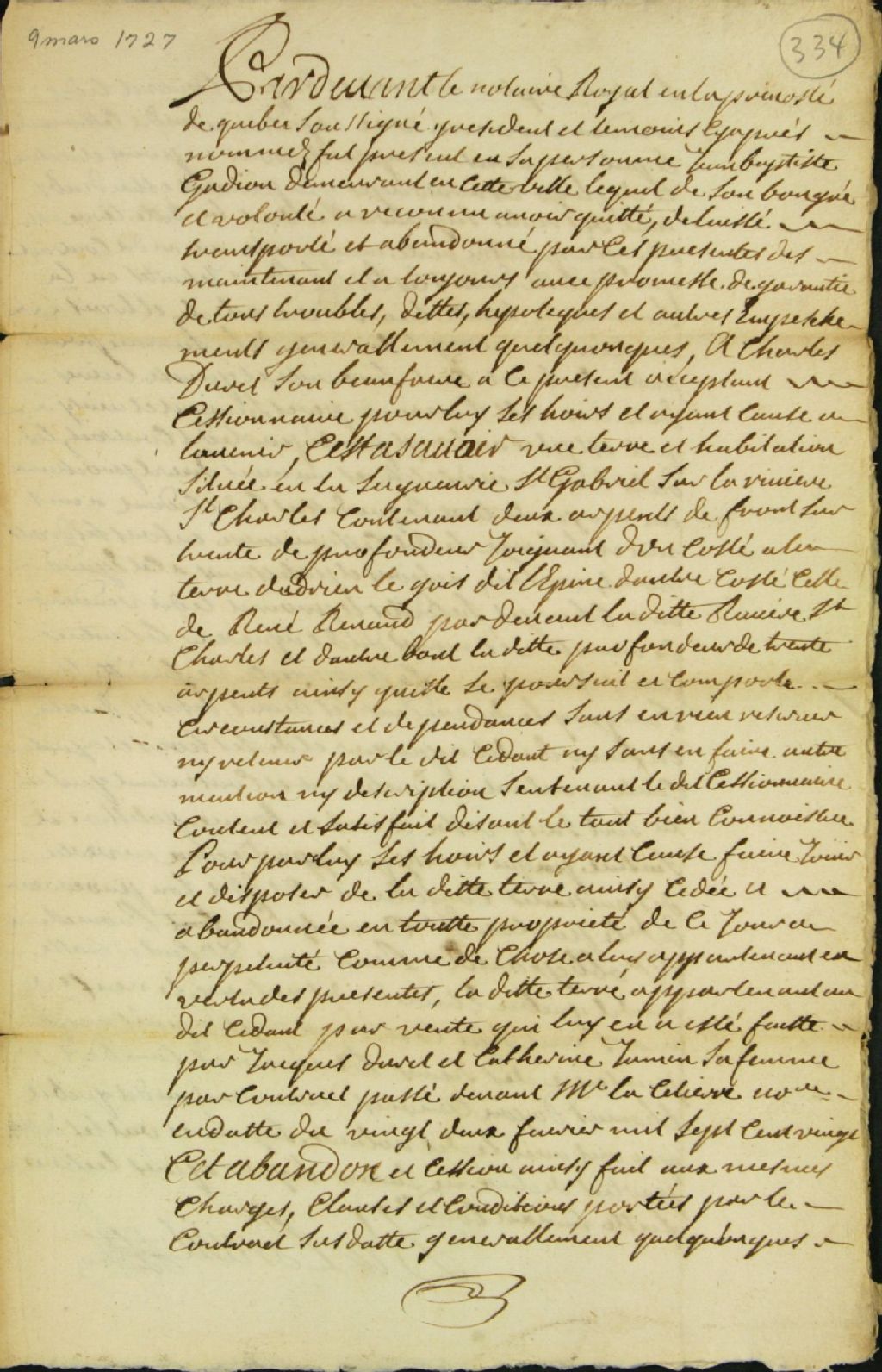 Acte de vente d'une terre donnant sur la rivière Saint-Charles dans la seigneurie Saint-Gabriel, par Jean-Baptiste Gadiou [dit Saint-Louis] demeurant à Québec à Charles Duret, son beau-frère, par-devant Jean-Étienne Dubreuil, notaire royal, 9 mars 1727, Archives nationales à Québec, Fonds Ministère des Terres et Forêts, (03Q,E21,S64,SS5,SSS6,D334).