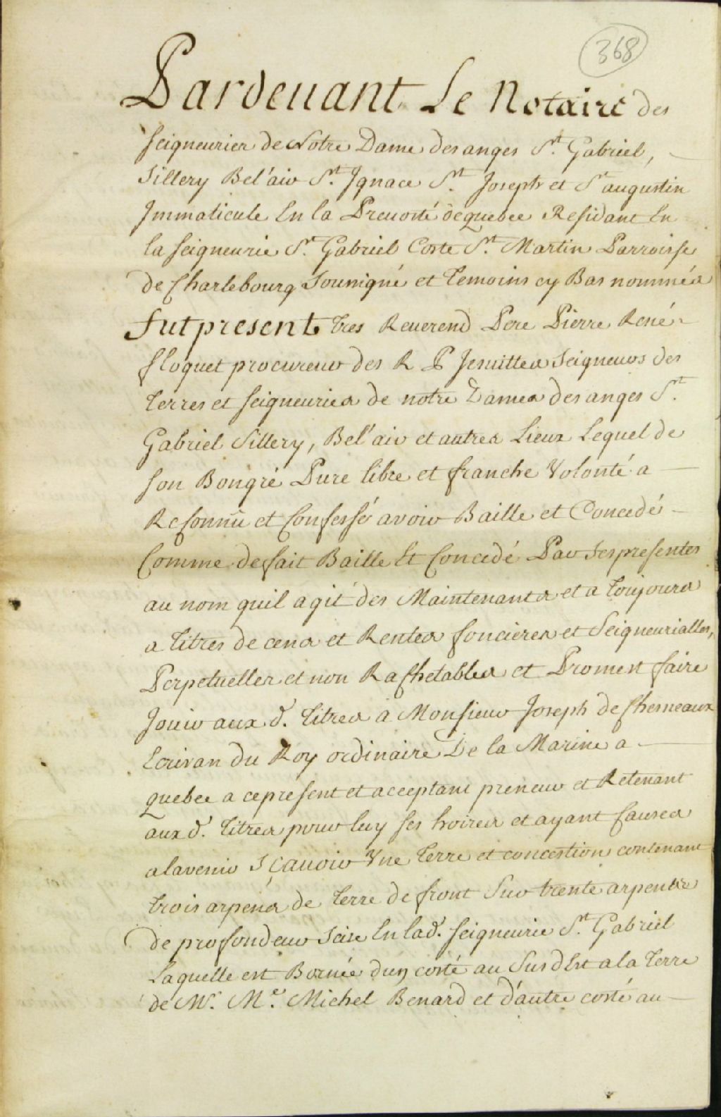 Acte de concession d'une terre située à la route Saint-Michel dans la seigneurie Saint-Gabriel, par les Révérends Pères Jésuites à Joseph [Brassard] Deschenaux, écrivain du Roi ordinaire de la marine à Québec, par-devant André Genest, notaire des seigneuries des Jésuites, et abandon (déguerpissement) de cette terre par Joseph [Brassard] Deschenaux, seigneur de Neuville et autres lieux, aux Révérends Pères Jésuites, devant Jean-Baptiste LeBrun, notaire royal