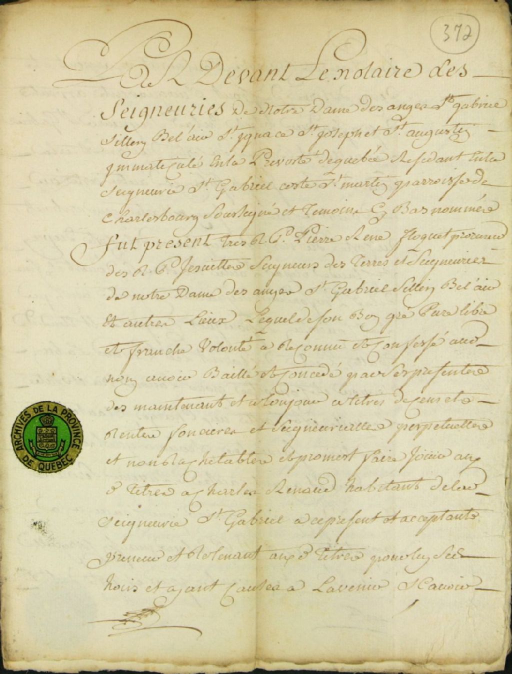 - Acte de concession d'une terre située à la côte Dupuy Saint-Claude dans la seigneurie Saint-Gabriel, par les Révérends Pères Jésuites à Charles Renaud, fils de Louis Renaud, habitant de la seigneurie Saint-Gabriel, par-devant André Genest, notaire des seigneuries des Jésuites