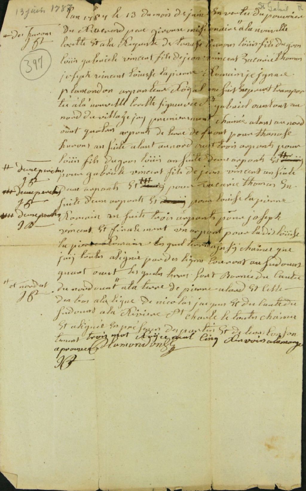 Copie du procès-verbal d'arpentage des terres nouvellement concédées aux Hurons de Nouvelle-Lorette (Jeune-Lorette), effectué par Ignace Plamondon fils, arpenteur royal, par le pouvoir du Révérend Père Girault (Giroux), Jésuite missionnaire, à la requête de Thomas le Huron, Louis fils du Gros Louis, Gabriel Vincent fils de Jean Vincent, Zacharie Thomas, Joseph Vincent, Louise Lapierre Romain