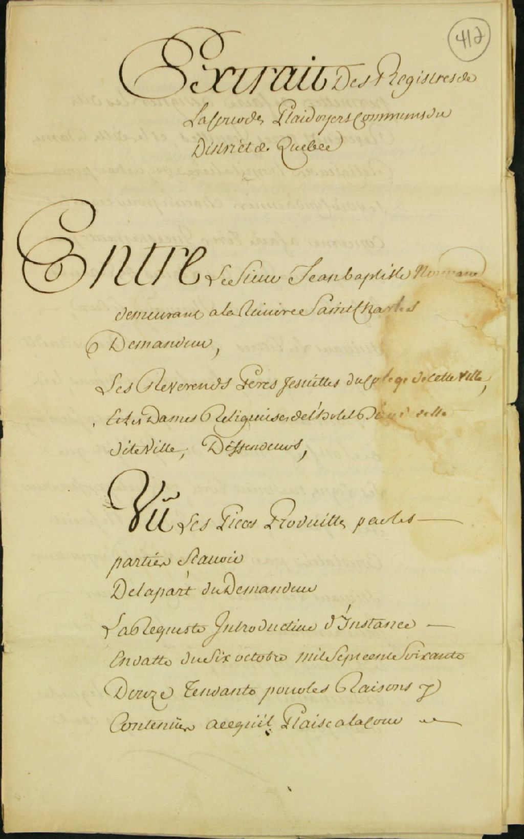 Extrait des Registres de la Cour des plaidoyers communs du District de Québec, colligé par Bruneau, greffier, d'une cause entre Jean-Baptiste Normand demeurant à la rivière Saint-Charles, demandeur, et les Révérends Pères Jésuites de Québec et les Dames Religieuses de l'Hôtel-Dieu de Québec, défendeurs, concernant la ligne seigneuriale entre le fief appartenant au demandeur (fief Hubert) et les seigneuries Saint-Ignace et Saint-Gabriel, appartenant aux défendeurs. La cour ordonne que les bornes posées par Louis Corbin, arpenteur juré, soient considérées comme ligne de séparation desdites seigneuries, et condamne les défendeurs aux dépenses des procédures et aux dépenses des deux voyages dudit Corbin