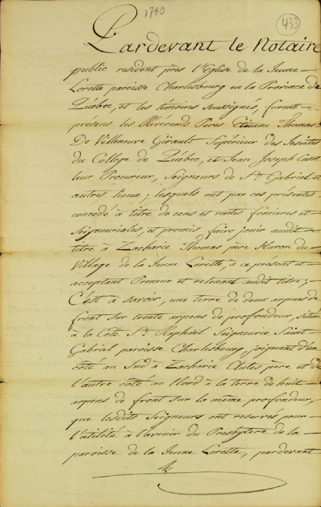 Acte de concession d'une terre située à la côte Saint-Raphaël, paroisse de Charlesbourg, dans la seigneurie Saint-Gabriel, par les Révérends Pères Jésuites à Zacharie Thomas père, Huron du village de la Jeune-Lorette, par-devant Jean-Baptiste Panet, notaire public, 7 juin 1790, Archives nationales à Québec, Fonds Ministère des Terres et Forêts, (03Q,E21,S64,SS5,SSS6,D433).