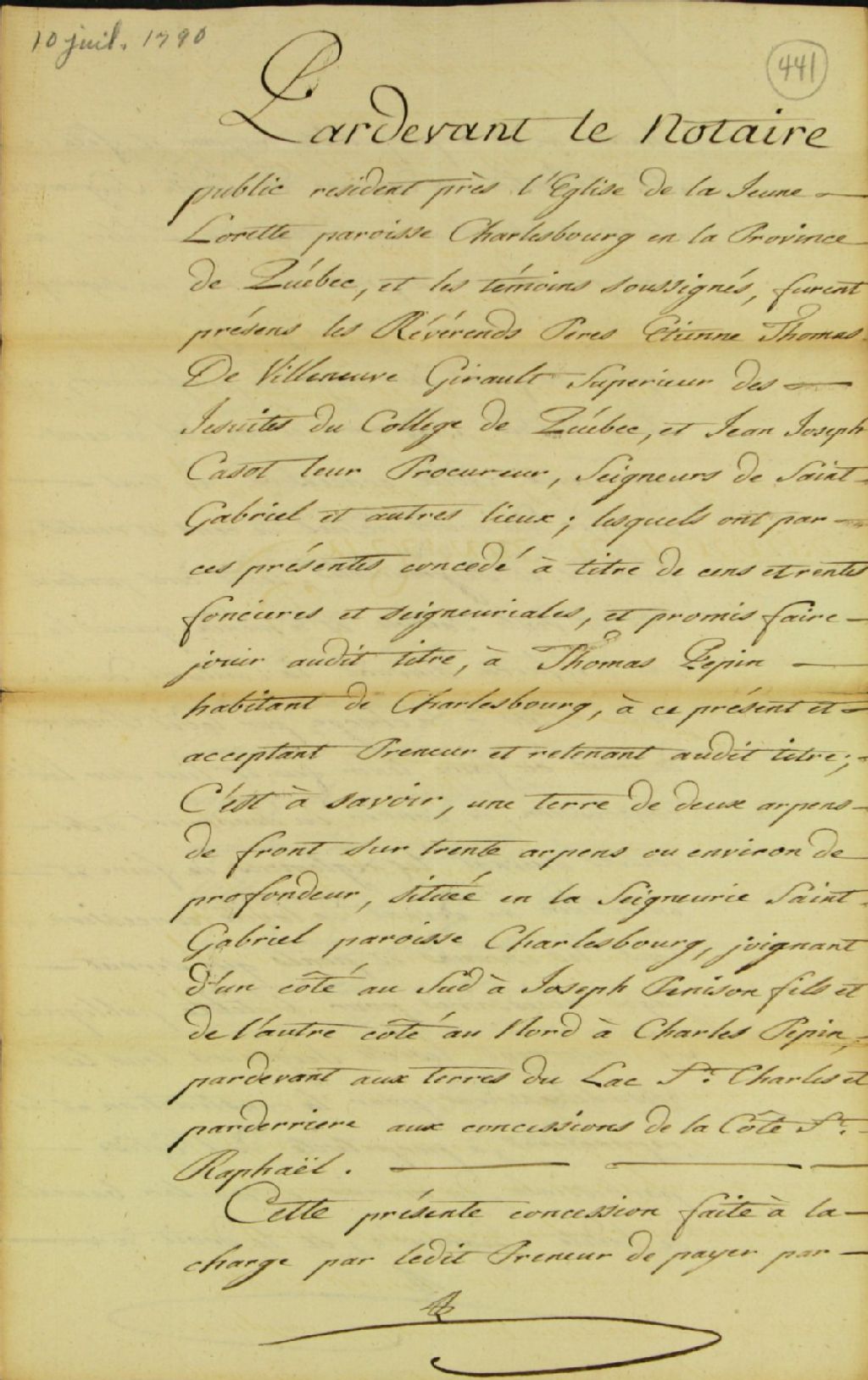 Acte de concession d'une terre située entre les terres du lac Saint-Charles et la côte Saint-Raphaël dans la seigneurie Saint-Gabriel, par les Révérends Pères Jésuites à Thomas Pepin, habitant de Charlesbourg, par-devant Jean-Baptiste Panet, notaire public, 10 juillet 1790, Archives nationales à Québec, Fonds Ministère des Terres et Forêts, (03Q,E21,S64,SS5,SSS6,D441).