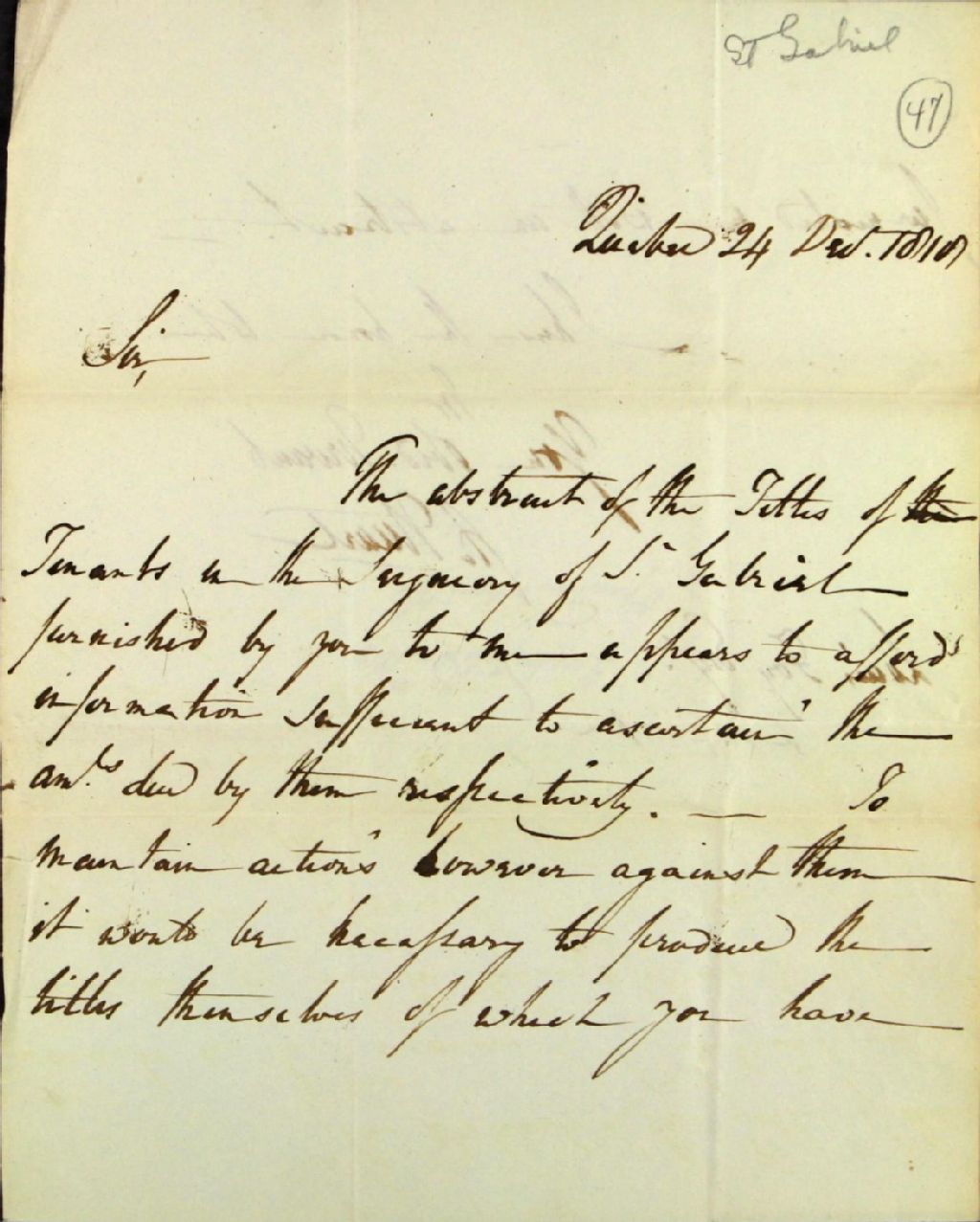 Lettre d'A. Stuart à Lewis Foy, écuyer, à propos de résumés de titres de la seigneurie Saint-Gabriel