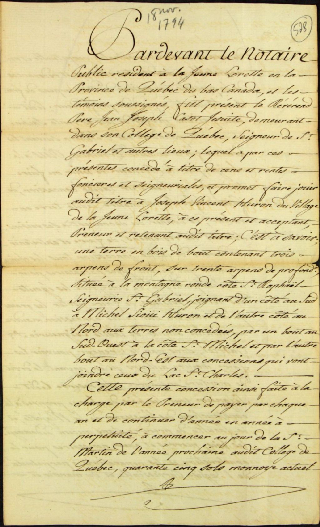 Acte de concession d'une terre à bois située à la montagne Ronde à la côte Saint-Raphaël, seigneurie Saint-Gabriel, par les Révérends Pères Jésuites à Joseph Vincent, Huron du village de la jeune-Lorette, par-devant Jean-Baptiste Panet, notaire public, 18 novembre 1794, Archives nationales à Québec, Fonds Ministère des Terres et Forêts, (03Q,E21,S64,SS5,SSS6,D528).
