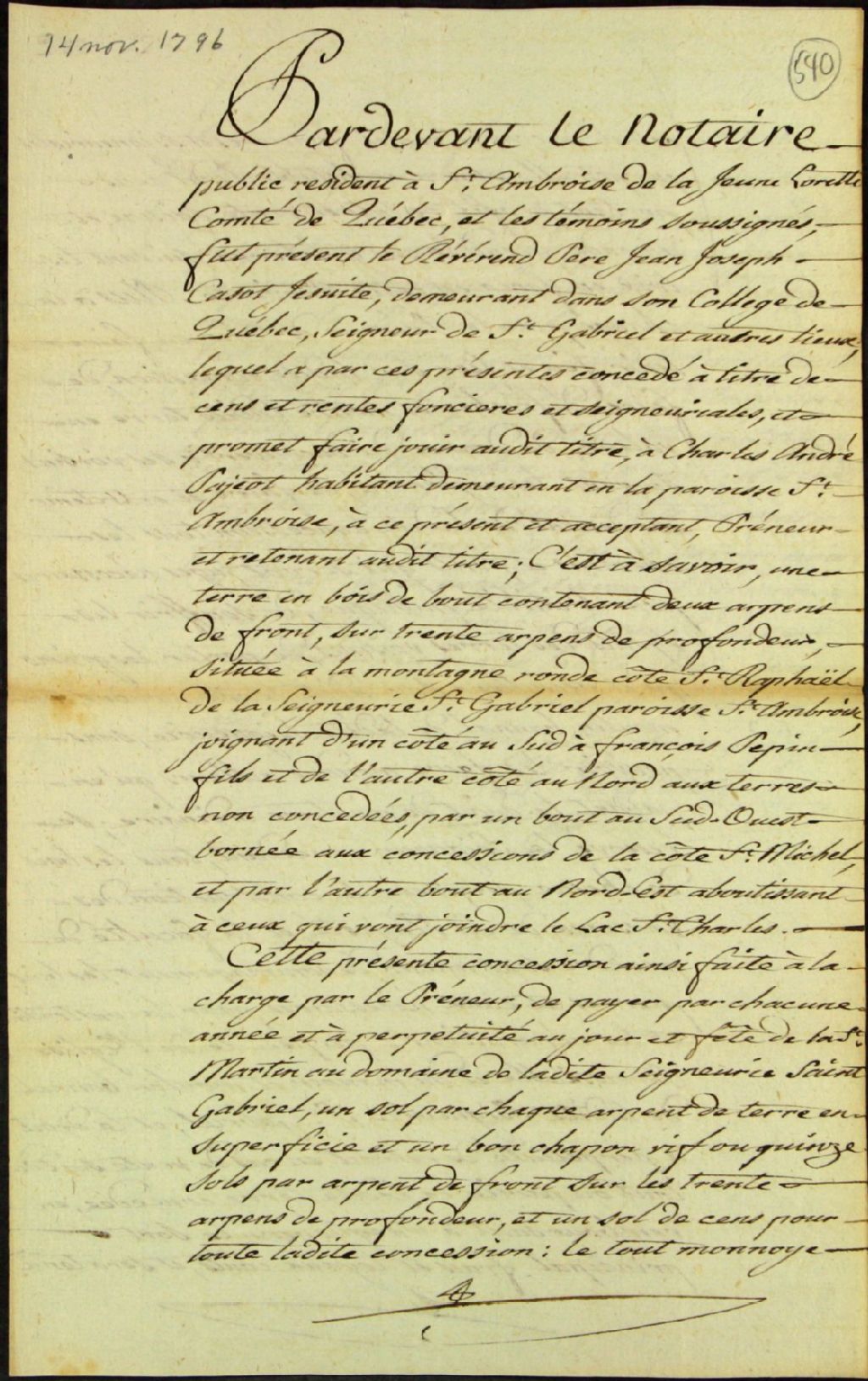 Acte de concession d'une terre située à la montagne Ronde, côte Saint-Raphaël, paroisse Saint-Ambroise dans la seigneurie Saint-Gabriel, par les Révérends Pères Jésuites à Charles-André Pageot (Pajot, Pageau), habitant demeurant à la paroisse de Saint-Ambroise, par-devant Jean-Baptiste Panet, notaire public, 14 novembre 1796, Archives nationales à Québec, Fonds Ministère des Terres et Forêts, (03Q,E21,S64,SS5,SSS6,D540).