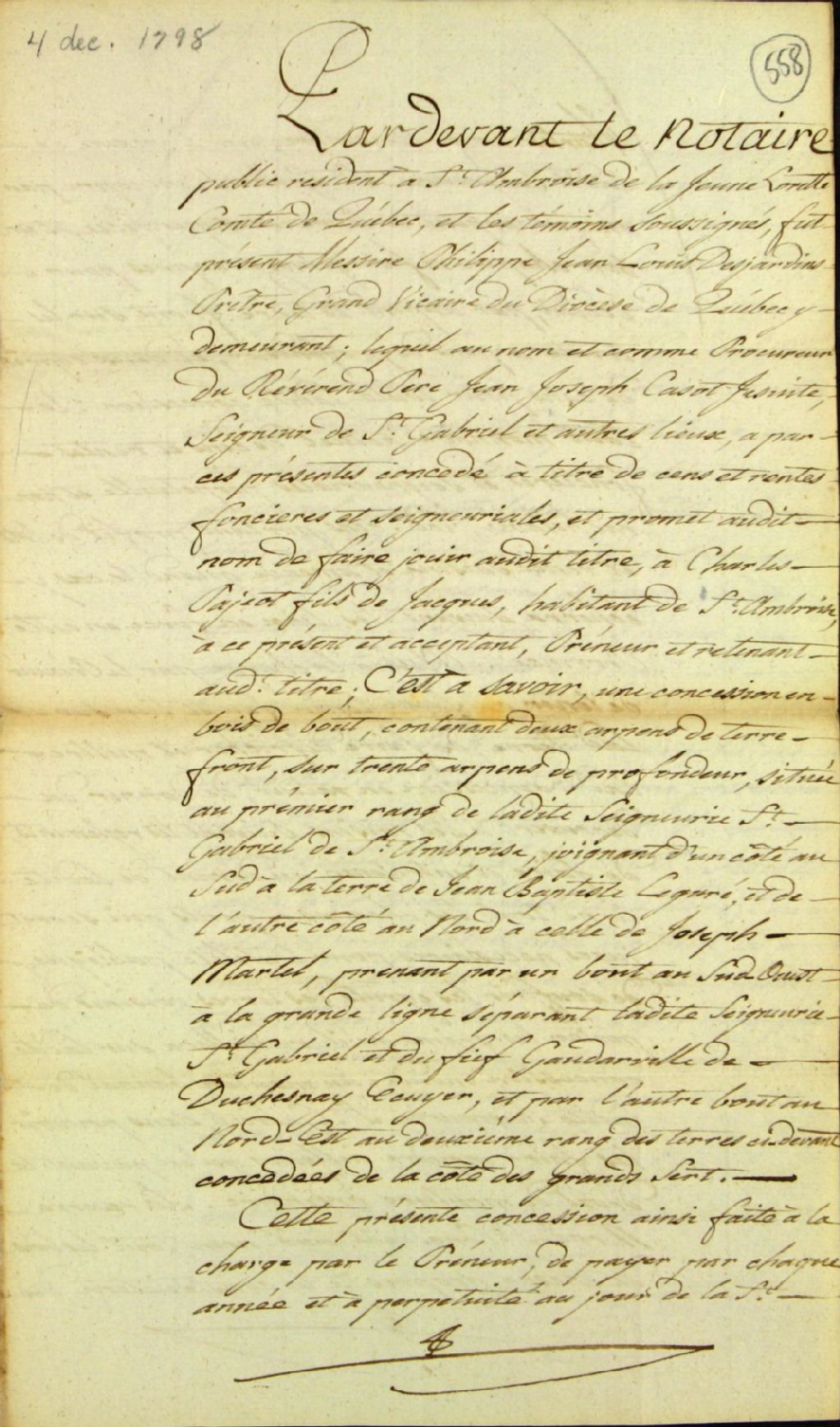 Acte de concession d'une terre située au premier rang de la seigneurie Saint-Gabriel de Saint-Ambroise, par les Révérends Pères Jésuites à Charles Pageot (Pajot, Pageau) fils de Jacques Pageot, habitant de Saint-Ambroise, par-devant Jean-Baptiste Panet, notaire public, 4 décembre 1798, Archives nationales à Québec, Fonds Ministère des Terres et Forêts, (03Q,E21,S64,SS5,SSS6,D558).