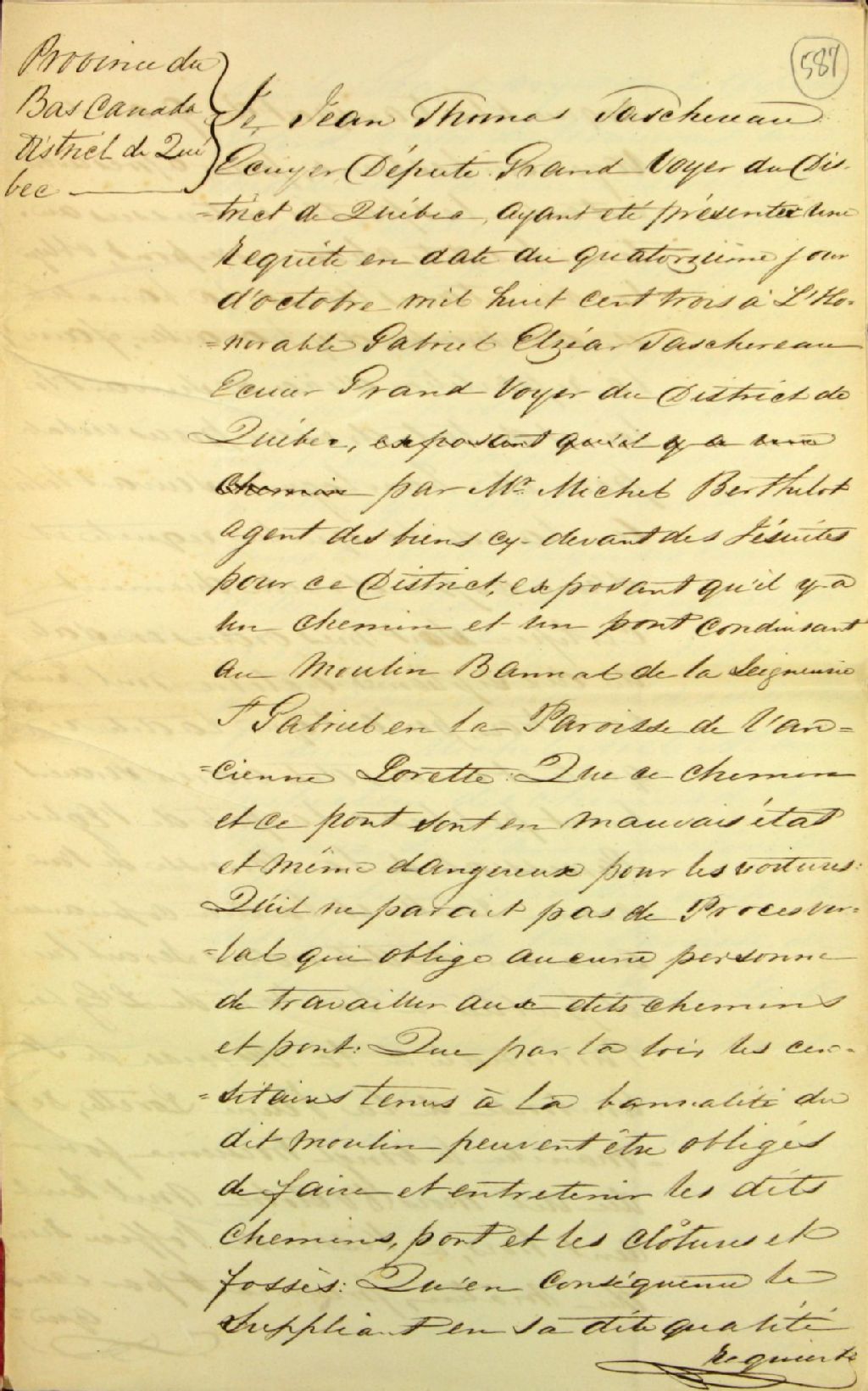 - Procès-verbal de Jean-Thomas Taschereau, écuyer, député grand voyer du district de Québec, qui fixe et règle le chemin pour conduire au moulin banal du fief Saint-Gabriel dans la paroisse de l'Ancienne-Lorette, déclarations de Michel-Noël Alain (Allain) et Ambroise Trudel (Trudelle), inspecteurs des chemins de la paroisse de Saint-Ambroise, qui certifient avoir lu et publié à la porte de l'église paroissiale de Saint-Ambroise de la Jeune-Lorette le procès-verbal de L.-T. Taschereau, et autres pièces relatives au dossier