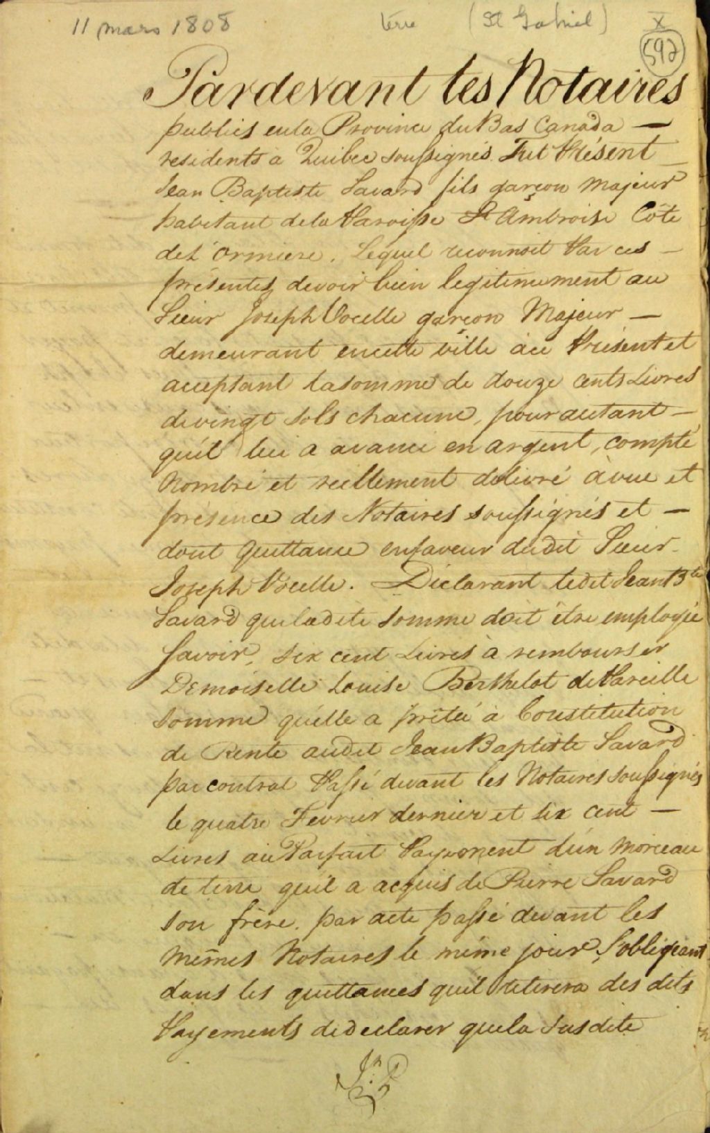 Constitution de rente (rente constituée) par Jean-Baptiste Savard fils, garçon majeur habitant de la côte de l'Ormière, paroisse Saint-Ambroise, sur des terres situées à la seigneurie Saint-Gabriel, en faveur de Joseph Vocelle, garçon majeur de Québec, par-devant Joseph Planté, notaire public, et mention de l'enregistrement de l'acte par Henry Weston, registraire adjoint, 11 mars 1808, Archives nationales à Québec, Fonds Ministère des Terres et Forêts, (03Q,E21,S64,SS5,SSS6,D592).