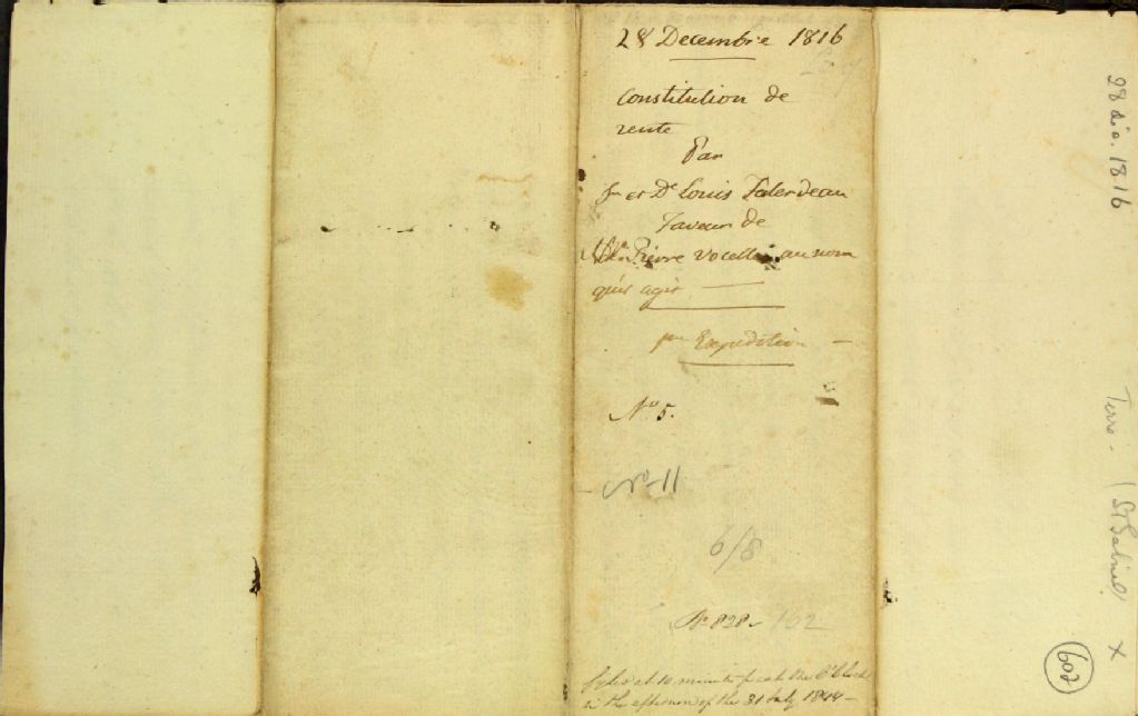 Constitution de rente (rente constituée) par Louis Falardeau, cultivateur de la paroisse de la Jeune-Lorette, et son épouse Louise Falardeau, sur une terre située le long de la rivière Saint-Charles dans la paroisse de Saint-Ambroise, une autre située à la Jeune-Lorette, également bornée par la rivière Saint-Charles, en faveur de Pierre Vocelle, bourgeois demeurant au faubourg Saint-Jean à Québec, au nom et comme exécuteur testamentaire de Louise Vocelle, veuve de Juste Mongeon, par-devant Roger Lelièvre, notaire public, et mention de l'enregistrement de l'acte par Henry Weston, registraire adjoint