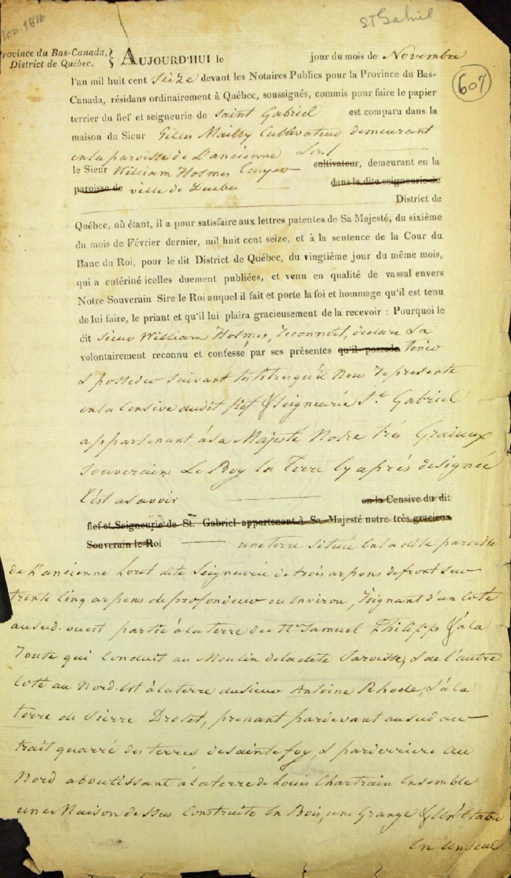 Déclaration de possession de terre (titre nouvel) en vue de confectionner le papier terrier du fief et seigneurie Saint-Gabriel, de William Holmes, écuyer de la ville de Québec, pour une terre située à la paroisse de l'Ancienne-Lorette, et acte de foi et hommage rendu devant Lewis Foy, écuyer, en sa qualité de procureur et au nom des commissaires des biens des Jésuites, novembre 1816, Archives nationales à Québec, Fonds Ministère des Terres et Forêts, (03Q,E21,S64,SS5,SSS6,D607).