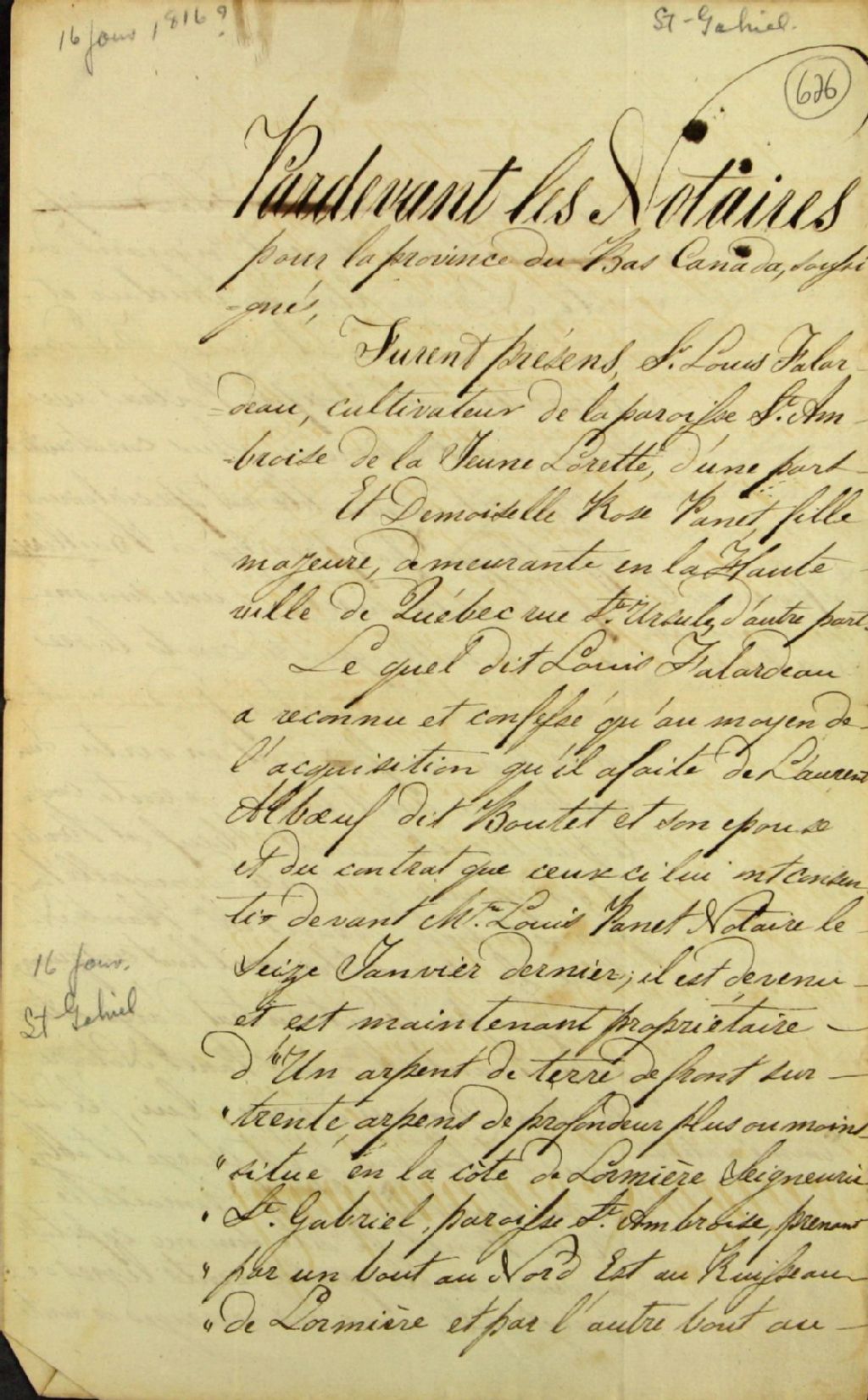 Brouillon d'acte de rente constituée appartenant à Louis Falardeau, cultivateur de Saint-Ambroise de la Jeune-Lorette, à prendre sur sa terre située à la côte de l'Ormière, seigneurie Saint-Gabriel, qu'il a acheté de Laurent Leboeuf (Alboeuf) dit Boutet, en faveur de Rose Verret, fille majeure demeurant à la Haute-Ville de Québec rue Saint-Ursule, janvier 1816, Archives nationales à Québec, Fonds Ministère des Terres et Forêts, (03Q,E21,S64,SS5,SSS6,D626).