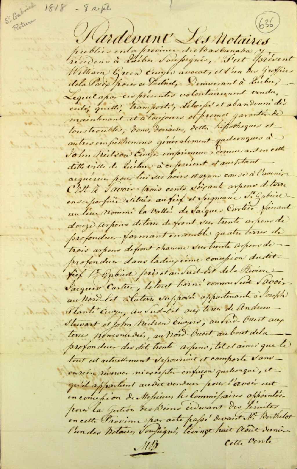 Acte de vente d'une terre située à la vallée Jacques-Cartier, seigneurie Saint-Gabriel, par William Green, écuyer, avocat, et l'un des greffiers de la Paix du district de Québec, demeurant à Québec, à John Neilson, écuyer et imprimeur demeurant à Québec, par-devant Michel Berthelot, notaire public