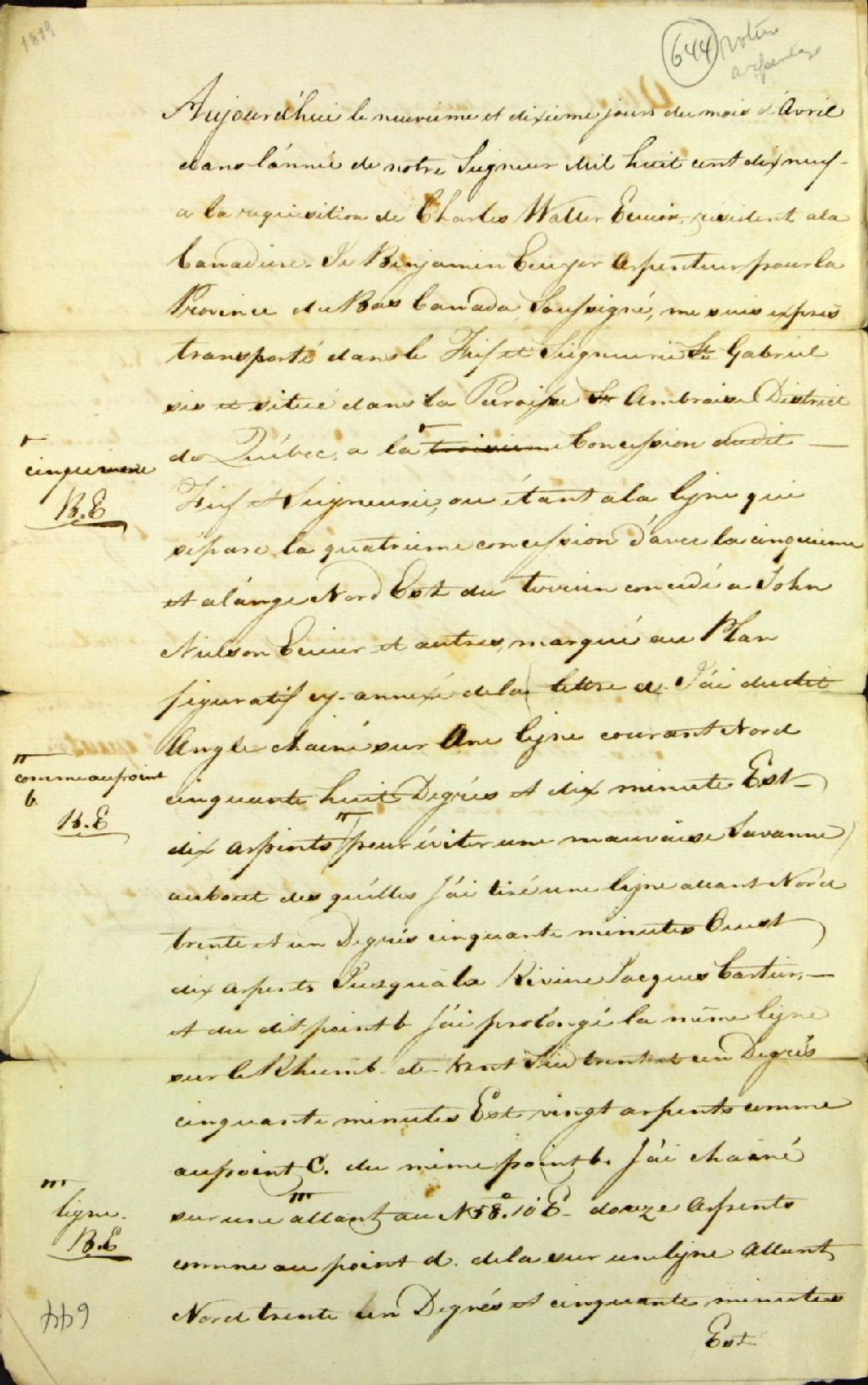 Procès-verbal d'arpentage et plan figuratif d'une terre située à la ligne qui sépare la quatrième et la cinquième concession, dans la paroisse Saint-Ambroise dans la seigneurie Saint-Gabriel, effectué par Benjamin Ecuyer, arpenteur, à la demande de Charles Waller, écuyer résidant à la Canardière, 9 avril 1819 - 10 avril 1819, Archives nationales à Québec, Fonds Ministère des Terres et Forêts, (03Q,E21,S64,SS5,SSS6,D644).