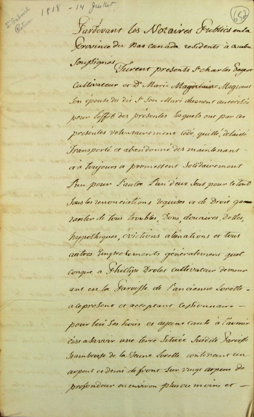 Acte de cession d'une terre située à la paroisse Saint-Ambroise de la Jeune-Lorette, par Charles Pageot (Pajot, Pageau), cultivateur, et son épouse Marie-Madeleine Magnan (Magnant), à Philippe Drolet (Drolette), cultivateur de l'Ancienne-Lorette, par-devant Roger Lelièvre, notaire public, 14 juillet 1818, Archives nationales à Québec, Fonds Ministère des Terres et Forêts, (03Q,E21,S64,SS5,SSS6,D652).