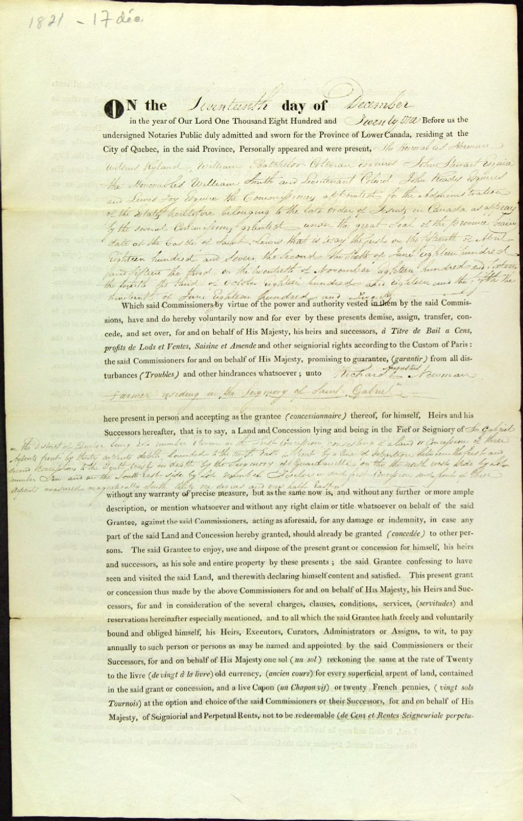 Acte de concession du lot 11 de la première concession de la seigneurie Saint-Gabriel, par la Commission des biens des Jésuites à Richard Augustus Newman, fermier de la seigneurie Saint-Gabriel, par-devant Archibald Campbell, notaire public, 17 décembre 1821, Archives nationales à Québec, Fonds Ministère des Terres et Forêts, (03Q,E21,S64,SS5,SSS6,D666).