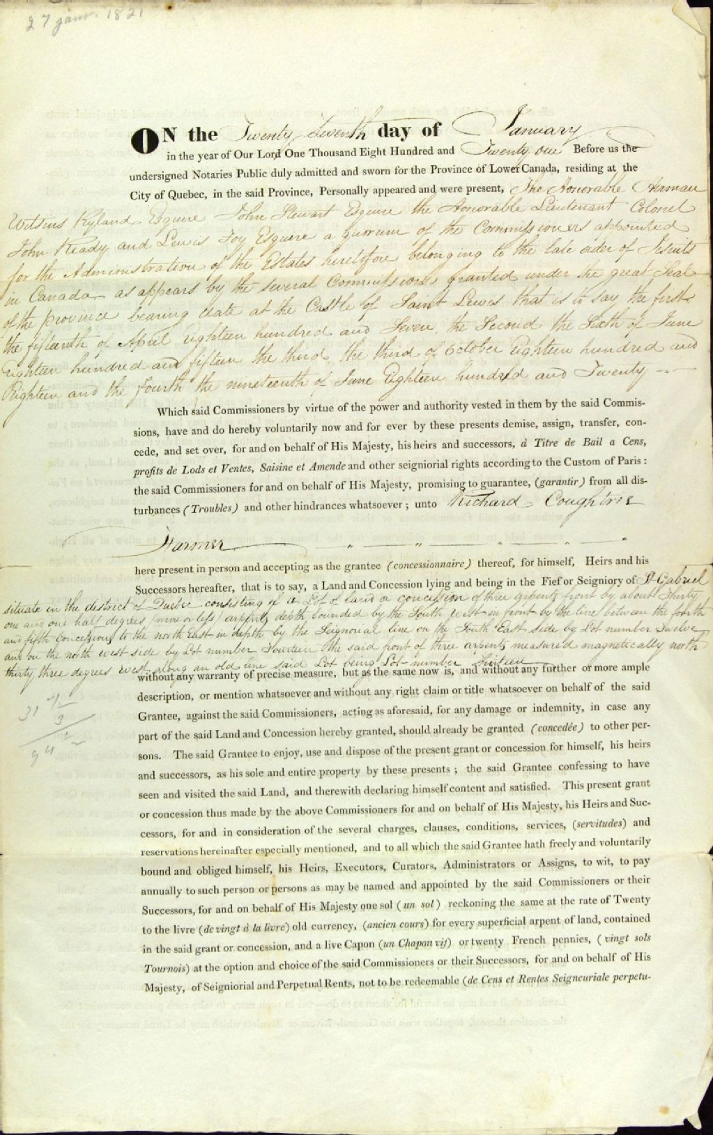 Acte de concession du lot 13 de la cinquième concession de la seigneurie Saint-Gabriel, par la Commission des biens des Jésuites à Richard Coughtrie, fermier, par-devant Archibald Campbell, notaire public, 27 janvier 1821, Archives nationales à Québec, Fonds Ministère des Terres et Forêts, (03Q,E21,S64,SS5,SSS6,D675).