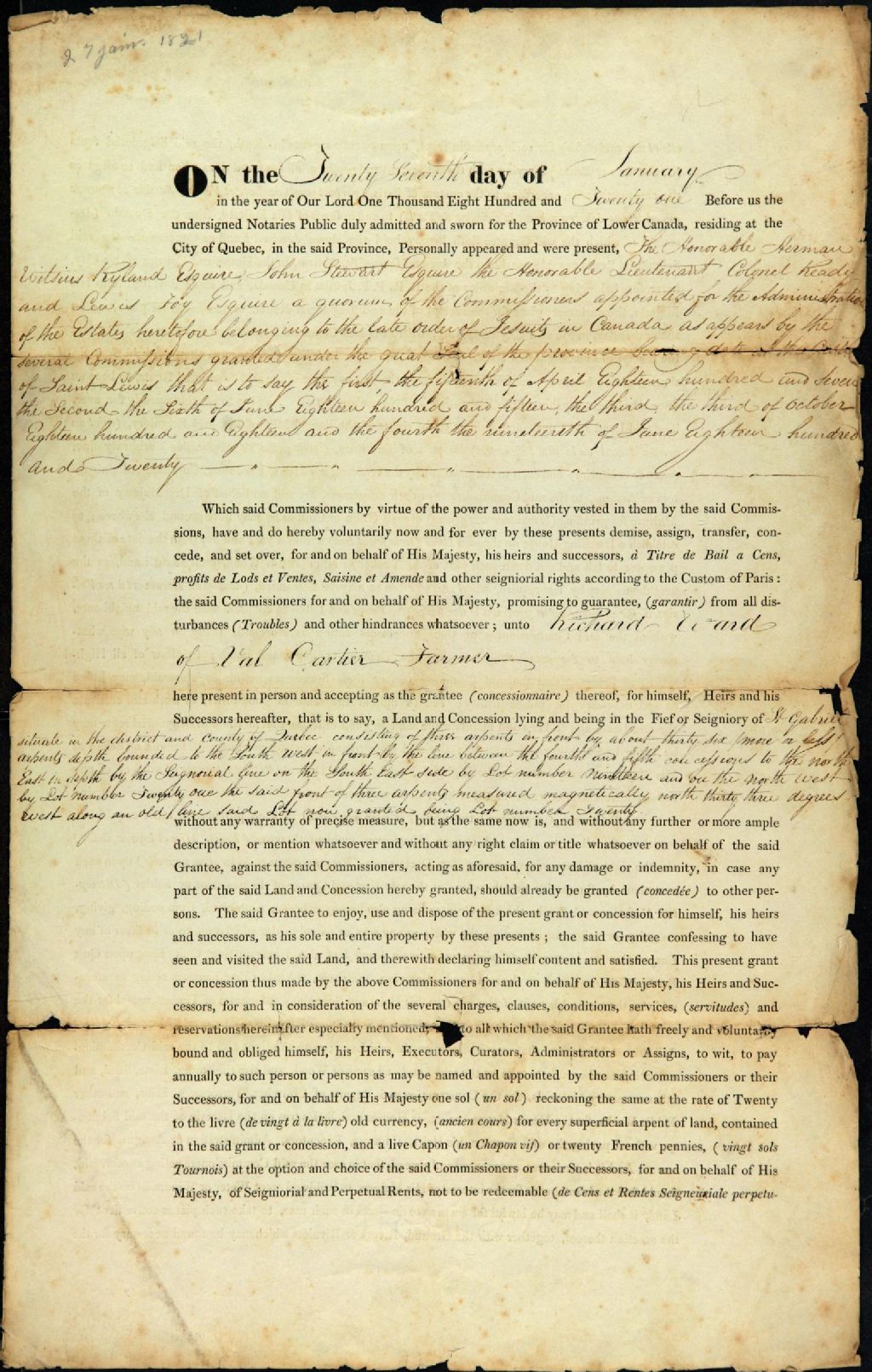 Acte de concession du lot 20 de la cinquième concession de la seigneurie Saint-Gabriel, par la Commission des biens des Jésuites à Richard Ward, fermier de Valcartier, par-devant Archibald Campbell, notaire public, 27 janvier 1821, Archives nationales à Québec, Fonds Ministère des Terres et Forêts, (03Q,E21,S64,SS5,SSS6,D677).