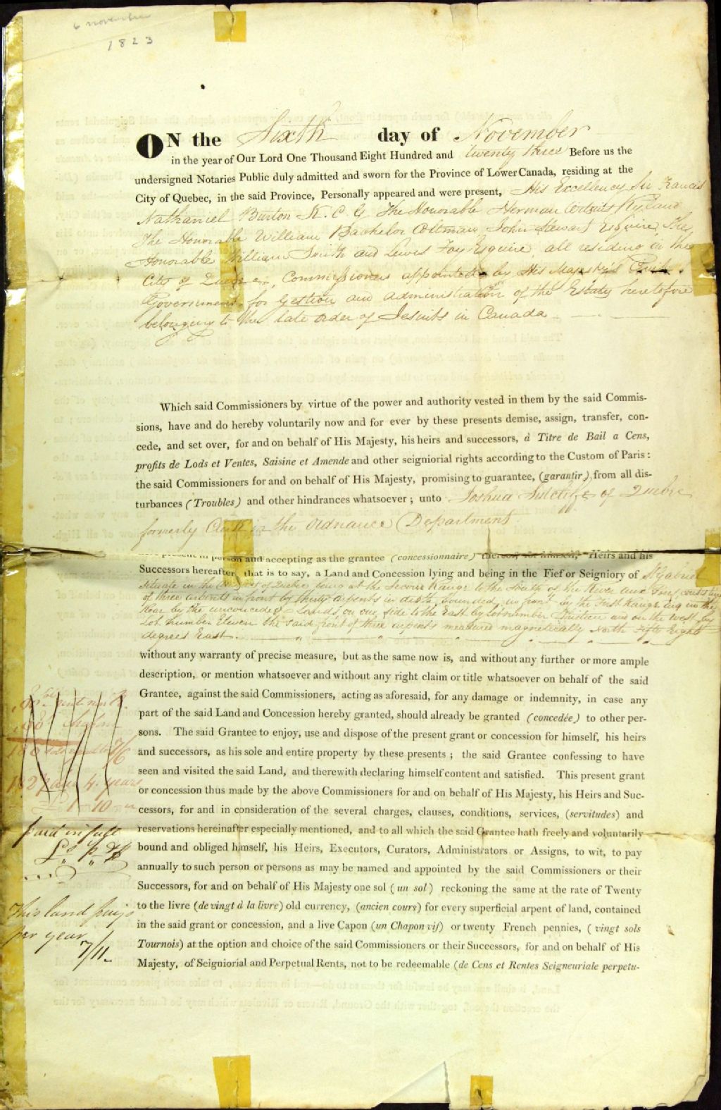 Acte de concession du lot 12 du deuxième rang au sud de la rivière aux Pins, seigneurie Saint-Gabriel, par la Commission des biens des Jésuites à Joshua Sutcliffe, écrivain du Département militaire, par-devant Archibald Campbell, notaire public, 6 novembre 1823, Archives nationales à Québec, Fonds Ministère des Terres et Forêts, (03Q,E21,S64,SS5,SSS6,D702).