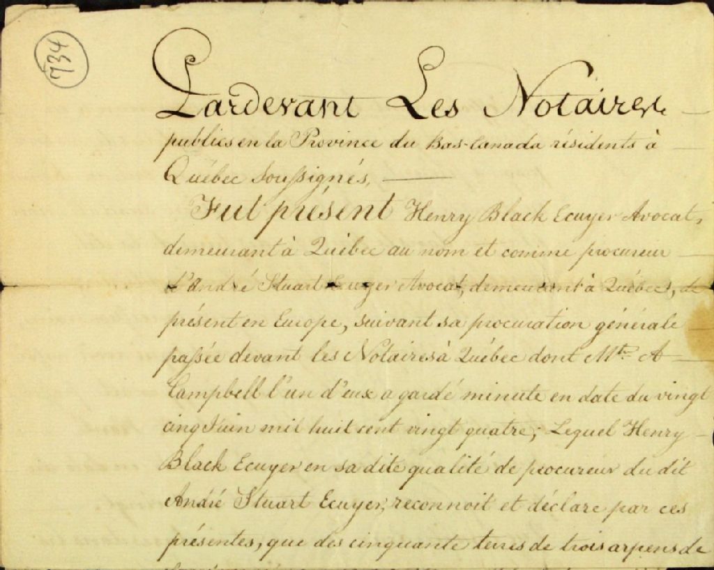 Frangment d'acte de déclaration par Henry Black, écuyer et avocat, comme procurateur d'Andrew Stuart (André), écuyer, en faveur d'Alexander Buchanan, probablement relatif à la possession de terres dans la seigneurie Saint-Gabriel, 20 septembre 1824, Archives nationales à Québec, Fonds Ministère des Terres et Forêts, (03Q,E21,S64,SS5,SSS6,D734).