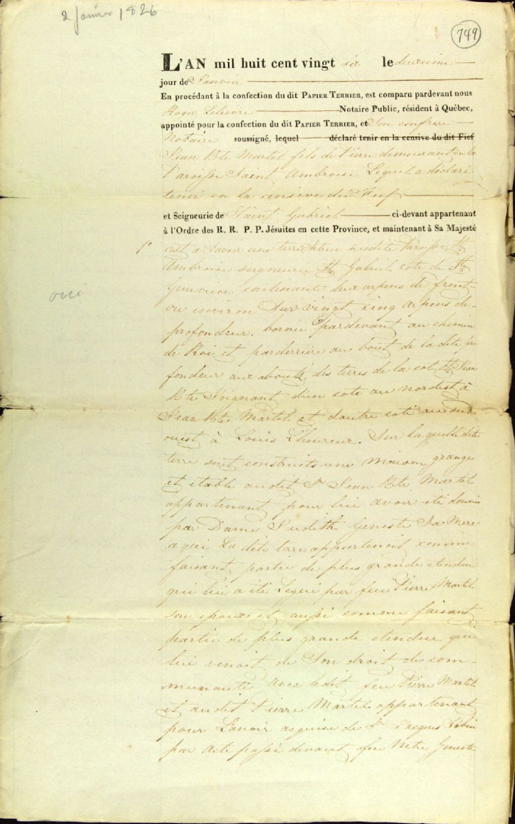 Déclaration de possession de terre (titre nouvel) en vue de confectionner le papier terrier du fief et seigneurie Saint-Gabriel, de Jean-Baptiste Martel, fils de Pierre Martel, de la paroisse Saint-Ambroise, pour des terres situées à la côte Sainte-Geneviève, à la première concession de la montagne Ronde et à la côte de l'Ormière, par-devant Roger Lelièvre et Robert Christie, notaires publics, 2 janvier 1826, Archives nationales à Québec, Fonds Ministère des Terres et Forêts, (03Q,E21,S64,SS5,SSS6,D749).