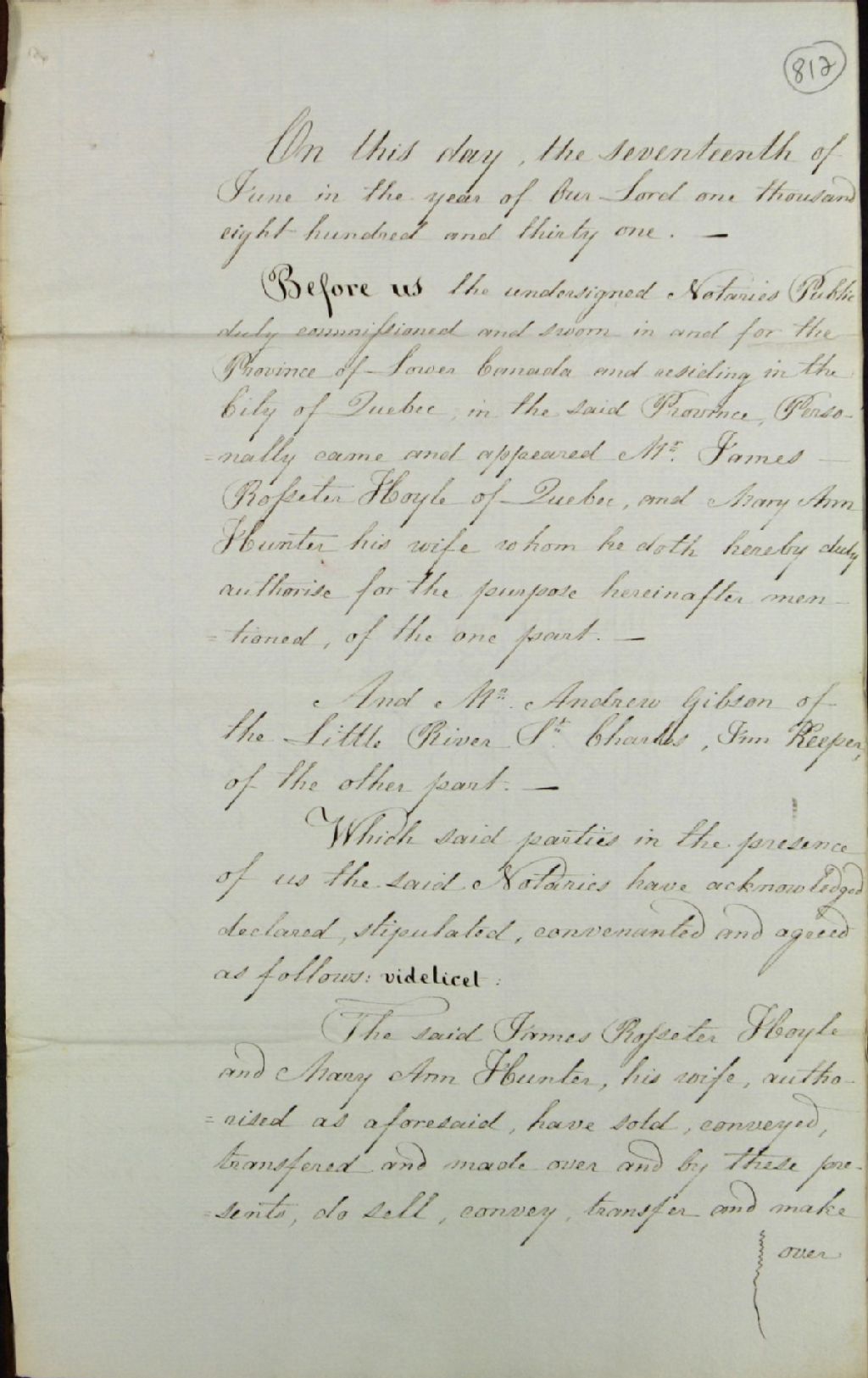 - Acte de vente d'une terre située en banlieue de Québec, sur la route menant à l'Ancienne-Lorette, par James Rosseter Hoyle de Québec, et son épouse Mary Ann Hunter, à Andrew Gibson de la Petite-Rivière-Saint-Charles, gardien (keeper), par-devant Louis Panet, notaire public, et note de calcul du 5 février 1836 relatif aux cens et rentes dus depuis la signature du contrat, signé [Francis Ward] Primrose