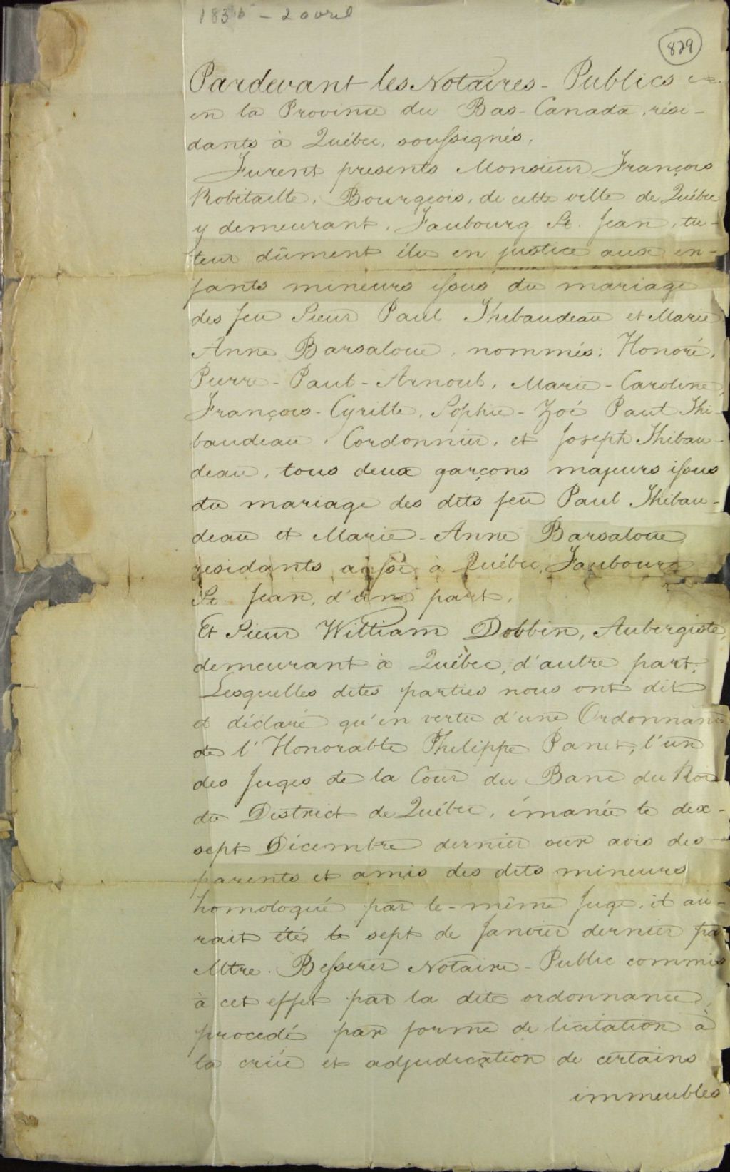Acte de vente d'une terre dans la seigneurie Saint-Gabriel, bornée devant par le chemin du Roi, à l'est par la ligne du Vallon et à l'ouest par la route de Valcartier, par François Robitaille, bourgeois du faubourg Saint-Jean de Québec, tuteur des enfants mineurs issus du mariage de feu Paul Thibodeau et Marie-Anne Barsalone, et de leurs deux fils majeurs, soit Paul Thibodeau, cordonnier et Joseph Thibodeau, résidant au même lieu, à William Dobbin, augergiste de Québec, par-devant Louis-Thomas Besserer, notaire public