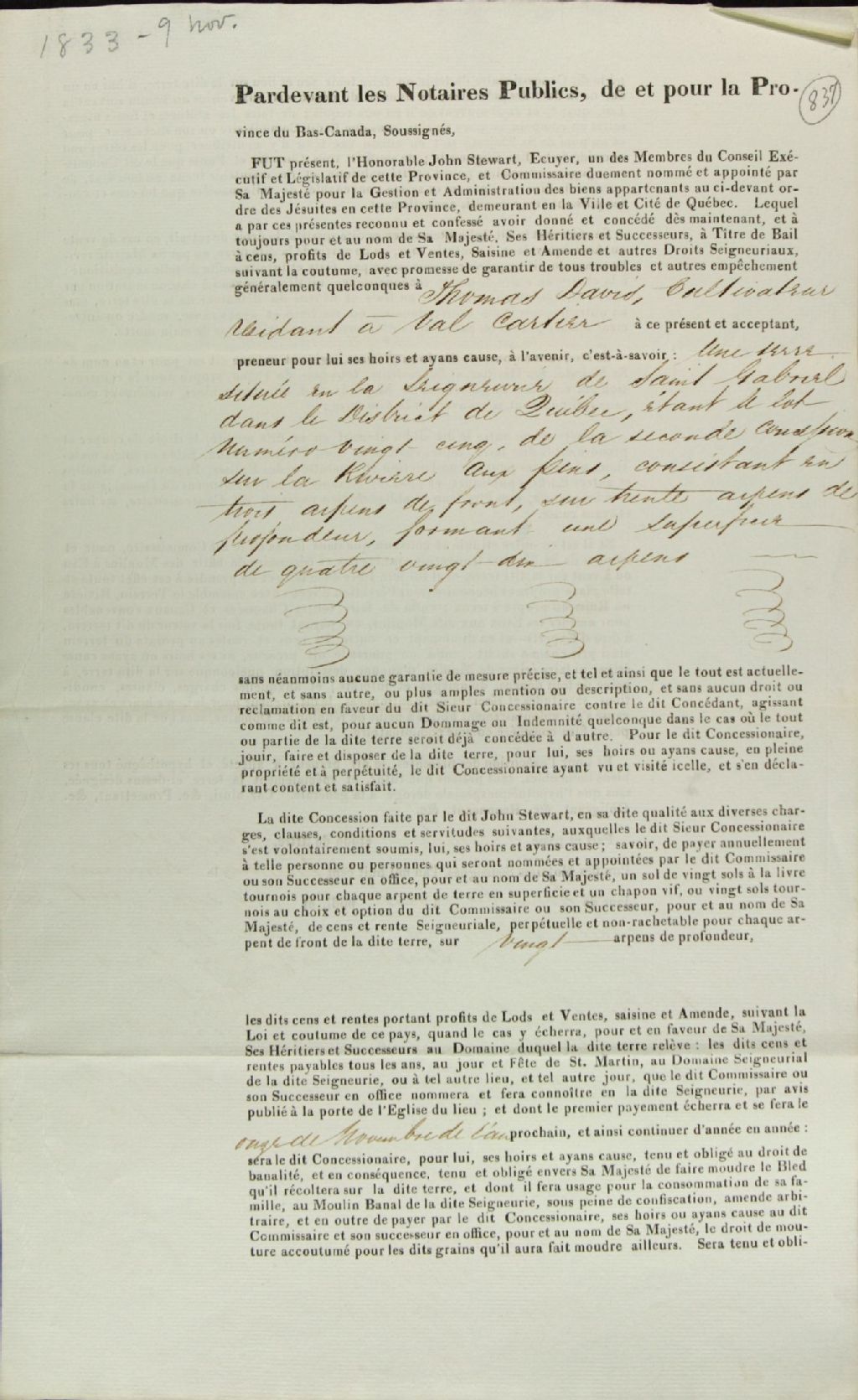 Acte de concession du lot 25 de la seconde concession sur la rivière aux Pins, seigneurie Saint-Gabriel, par John Stewart, écuyer, membre du Conseil exécutif de la province du Bas-Canada et commissaire des biens des Jésuites, à Thomas Davis, cultivateur à Valcartier, par-devant Archibald Campbell, notaire public, 9 novembre 1833, Archives nationales à Québec, Fonds Ministère des Terres et Forêts, (03Q,E21,S64,SS5,SSS6,D837).