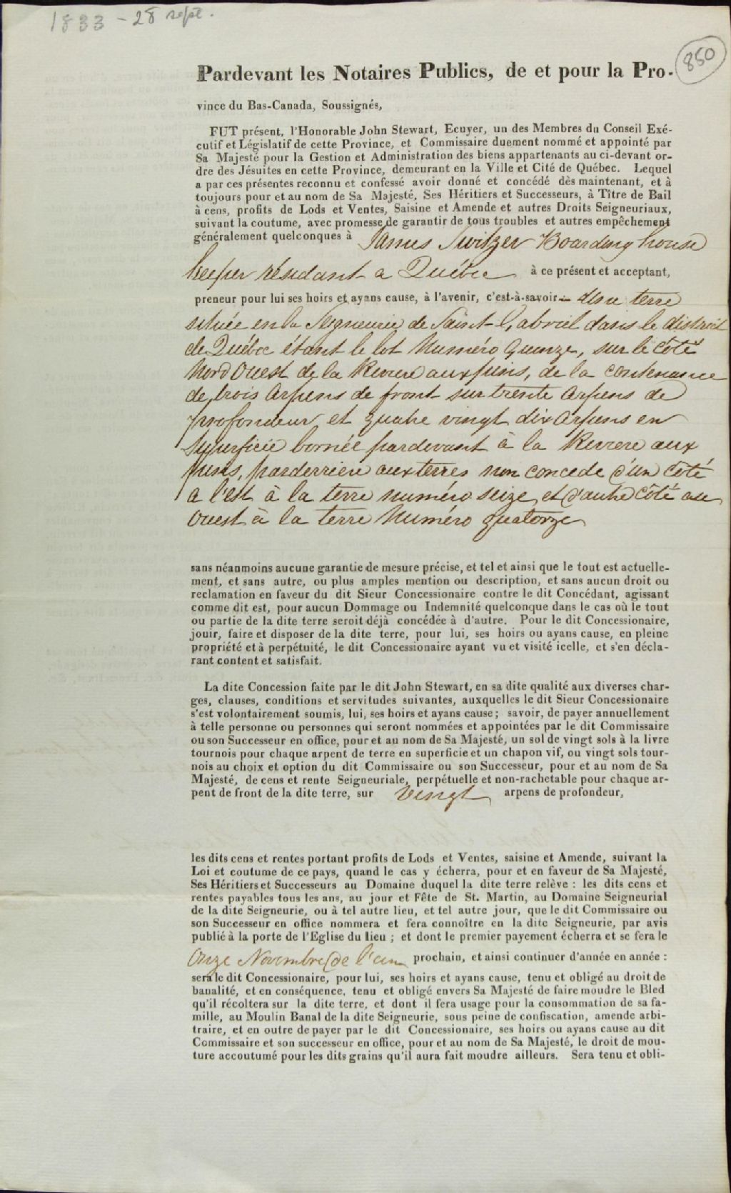 Acte de concession du lot 15 du premier rang au nord-ouest de la rivière aux Pins, seigneurie Saint-Gabriel, district de Québec, par John Stewart, écuyer, membre du Conseil exécutif de la province du Bas-Canada et commissaire des biens des Jésuites, à James Switzer, patron de pension de famille (boarding house keeper) de Québec, par-devant Archibald Campbell, notaire public, 28 septembre 1833, Archives nationales à Québec, Fonds Ministère des Terres et Forêts, (03Q,E21,S64,SS5,SSS6,D850).