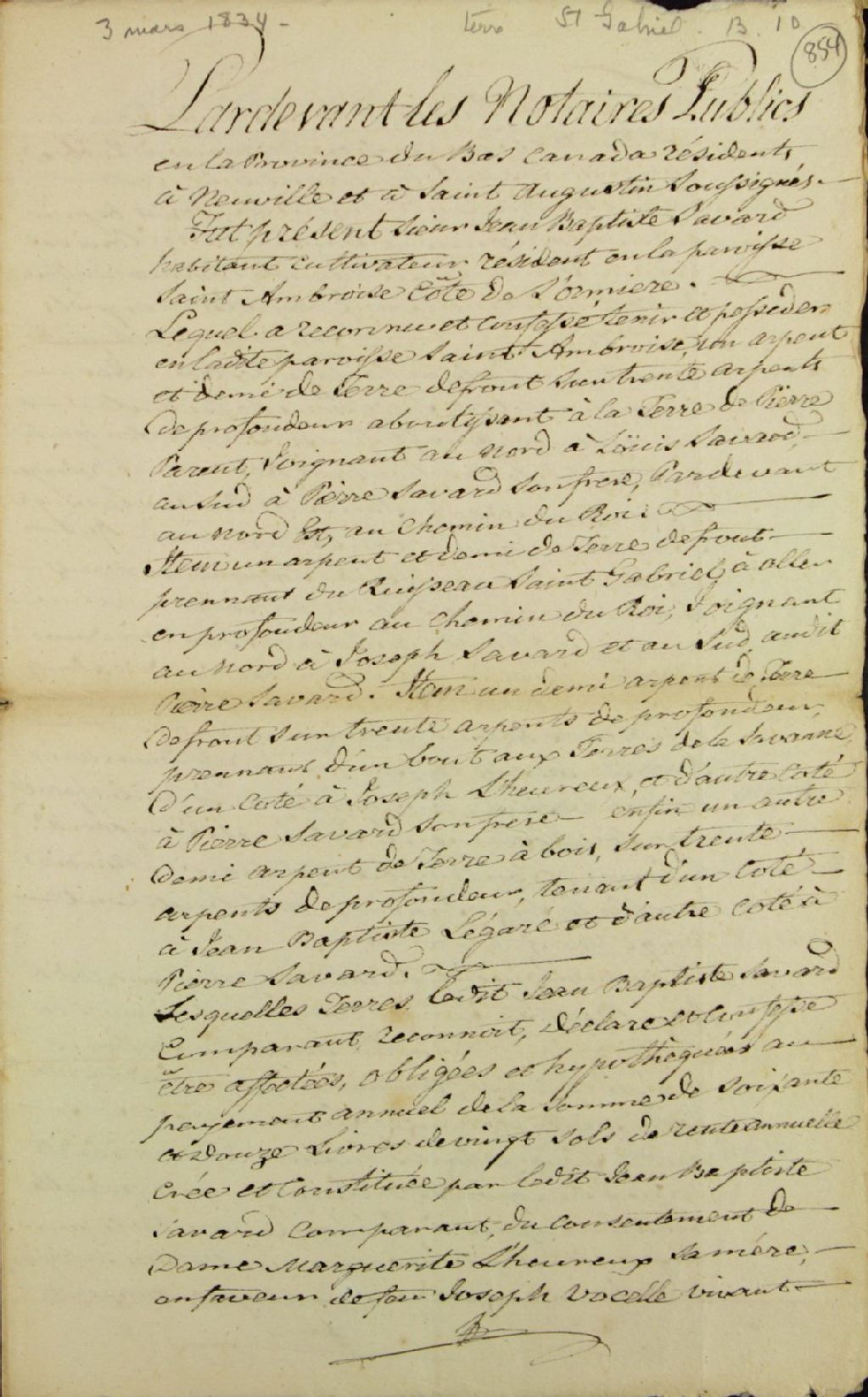 Titre nouvel de rente constituée par Jean-Baptiste Savard, cultivateur de la paroisse Saint-Ambroise, côte de l'Ormière, seigneurie Saint-Gabriel, avec le consentement de Marguerite L'Heureux (L'Héro, Lereau) sa mère, sur deux terres située dans la seigneurie Saint-Gabriel et bornées au chemin du Roi, en faveur de feu Joseph Vocelle, de son vivant bourgeois de Québec, et reçue en héritage par feu Marie-Louise Vézina, veuve de Louis Paquet (Pâquette), qui la laisse en héritage à Charles-Hilaire Têtu, marchand résidant à la Rivière-Ouelle, et à Marie Paquet (Pâquette) son épouse, par-devant François-Xavier Larue, notaire public