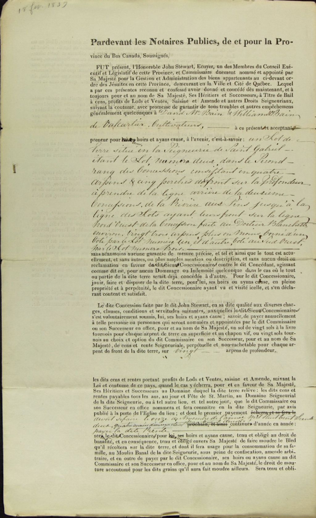 Acte de concession du lot 2 du deuxième rang des concessions de la rivière aux Pins, seigneurie Saint-Gabriel, par John Stewart, écuyer, membre du Conseil exécutif de la province du Bas-Canada et commissaire des biens des Jésuites, à David McBain et William McBain, cultivateurs de Valcartier, par-devant Archibald Campbell, notaire public, 18 février 1837, Archives nationales à Québec, Fonds Ministère des Terres et Forêts, (03Q,E21,S64,SS5,SSS6,D862).