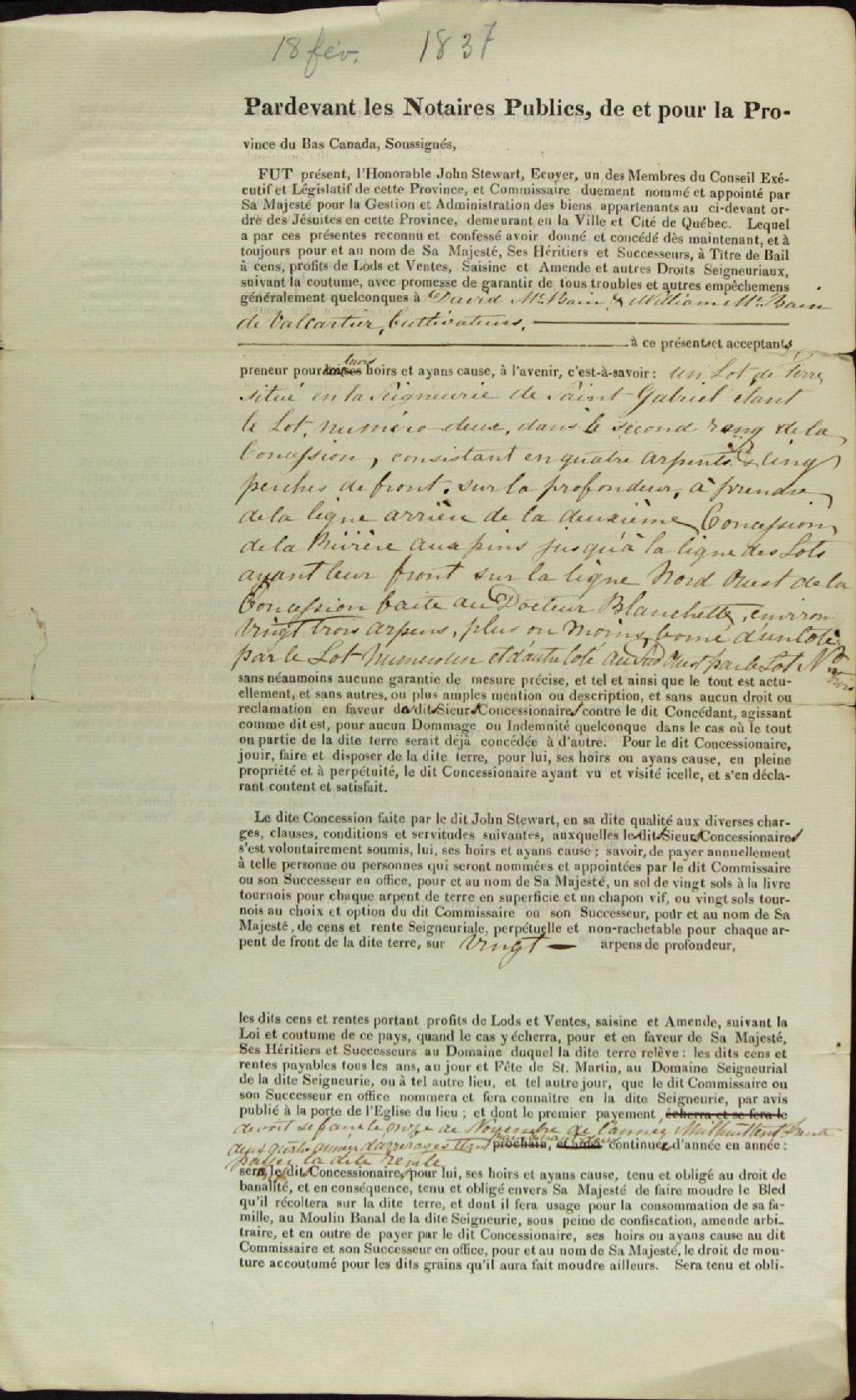 Acte de concession du lot 2 du deuxième rang des concessions de la rivière aux Pins, seigneurie Saint-Gabriel, par John Stewart, écuyer, membre du Conseil exécutif de la province du Bas-Canada et commissaire des biens des Jésuites, à David McBain et William McBain, cultivateurs de Valcartier, par-devant Archibald Campbell, notaire public, 18 février 1837, Archives nationales à Québec, Fonds Ministère des Terres et Forêts, (03Q,E21,S64,SS5,SSS6,D863).