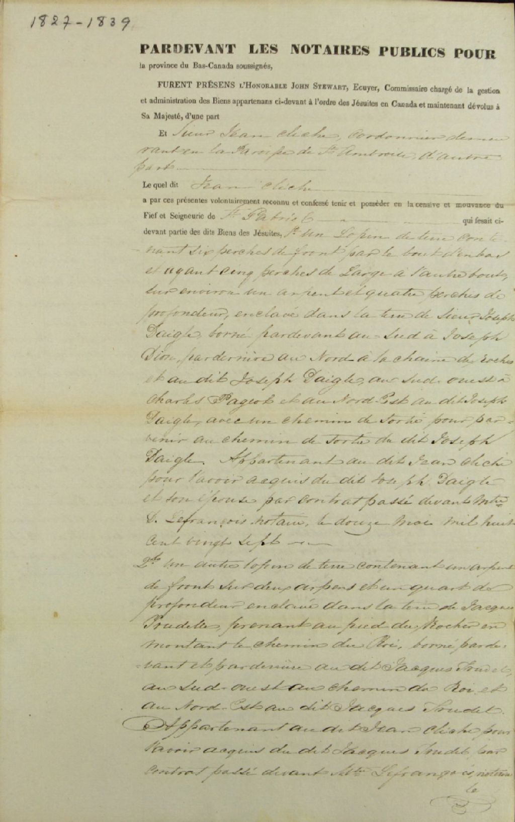 Titre nouvel de Jean Cliche, cordonnier de Saint-Ambroise, pour trois terres, l'une enclavée dans la terre de Joseph Daigle, la seconde enclavée dans la terre de Jacques Trudel (Trudelle), et la dernière enclavée dans la terre de Joseph Duchesneau père, toutes situées dans la seigneurie Saint-Gabriel, par John Stewart, écuyer, membre du Conseil exécutif de la province du Bas-Canada et commissaire des biens des Jésuites, par-devant Louis Panet, notaire public