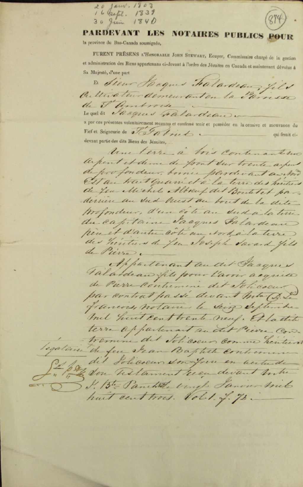 Titre nouvel de Jacques Falardeau fils, cultivateur de la paroisse Saint-Ambroise, pour une terre bornée au nord-est au trait-carré (trait-quarré), seigneurie Saint-Gabriel, par John Stewart, écuyer, membre du Conseil exécutif de la province du Bas-Canada et commissaire des biens des Jésuites, par-devant Louis Panet, notaire public, 20 juillet 1840, Archives nationales à Québec, Fonds Ministère des Terres et Forêts, (03Q,E21,S64,SS5,SSS6,D874).