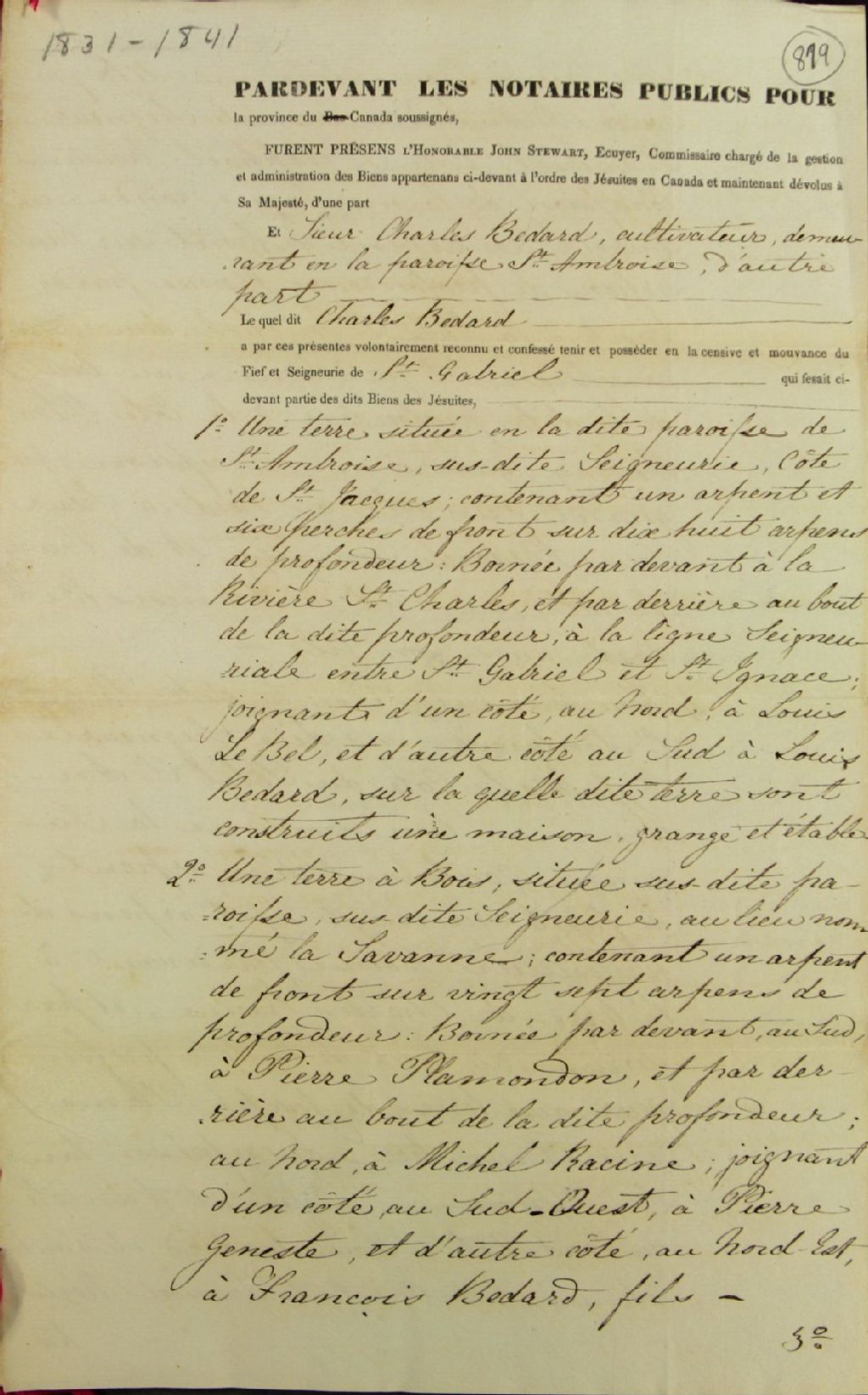 Titre nouvel de Charles Bédard, cultivateur de Saint-Ambroise, pour neuf terres situées dans la seigneurie Saint-Gabriel, soit à Saint-Ambroise le long de la rivière Saint-Charles, à la Savanne, à la troisième concession de la côte Saint-Raphaël, à la côte du Petit Saint-Antoine, au nord du trait-carré (trait-quarré) d la côte Saint-Gabriel, à la Misère ou côte Saint-Jacques et le long de la ligne seigneuriale entre Saint-Gabriel et la seigneurie des Dames de l'Hôtel-Dieu de Québec (Saint-Ignace), par John Stewart, écuyer, membre du Conseil exécutif de la province du Bas-Canada et commissaire des biens des Jésuites, par-devant Louis Panet, notaire public